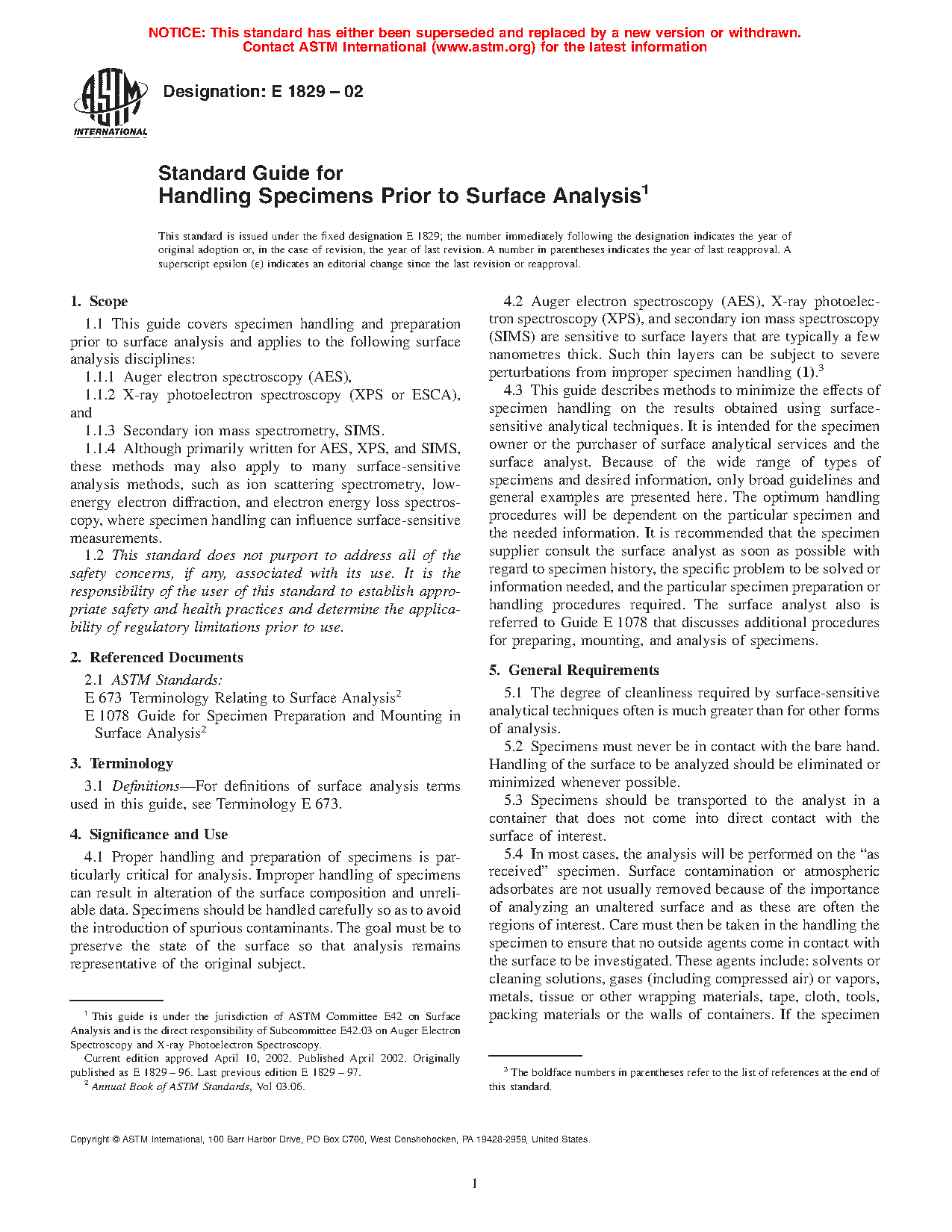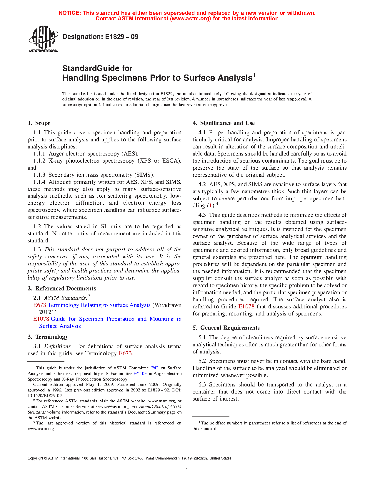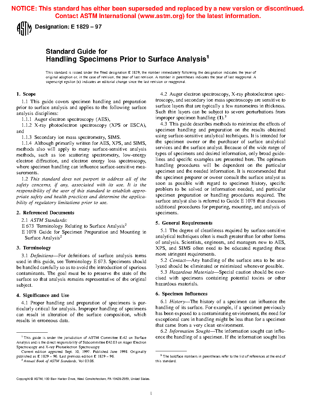 4.3 This guide describes methods to minimize the effects of specimen handling on the results obtained using surface-sensitive analytical techniques. It is intended for the specimen owner or the purchaser of surface analytical services and the surface analyst. Because of the wide range of types of specimens and desired information, only broad guidelines and general examples are presented here. The optimum handling procedures will be dependent on the particular specimen and the needed information. It is recommended that the specimen supplier consult the surface analyst as soon as possible with regard to specimen history, the specific problem to be solved or information needed, and the particular specimen preparation or handling procedures required. The surface analyst also is referred to Guide E1078 that discusses additional procedures for preparing, mounting, and analysis of specimens.