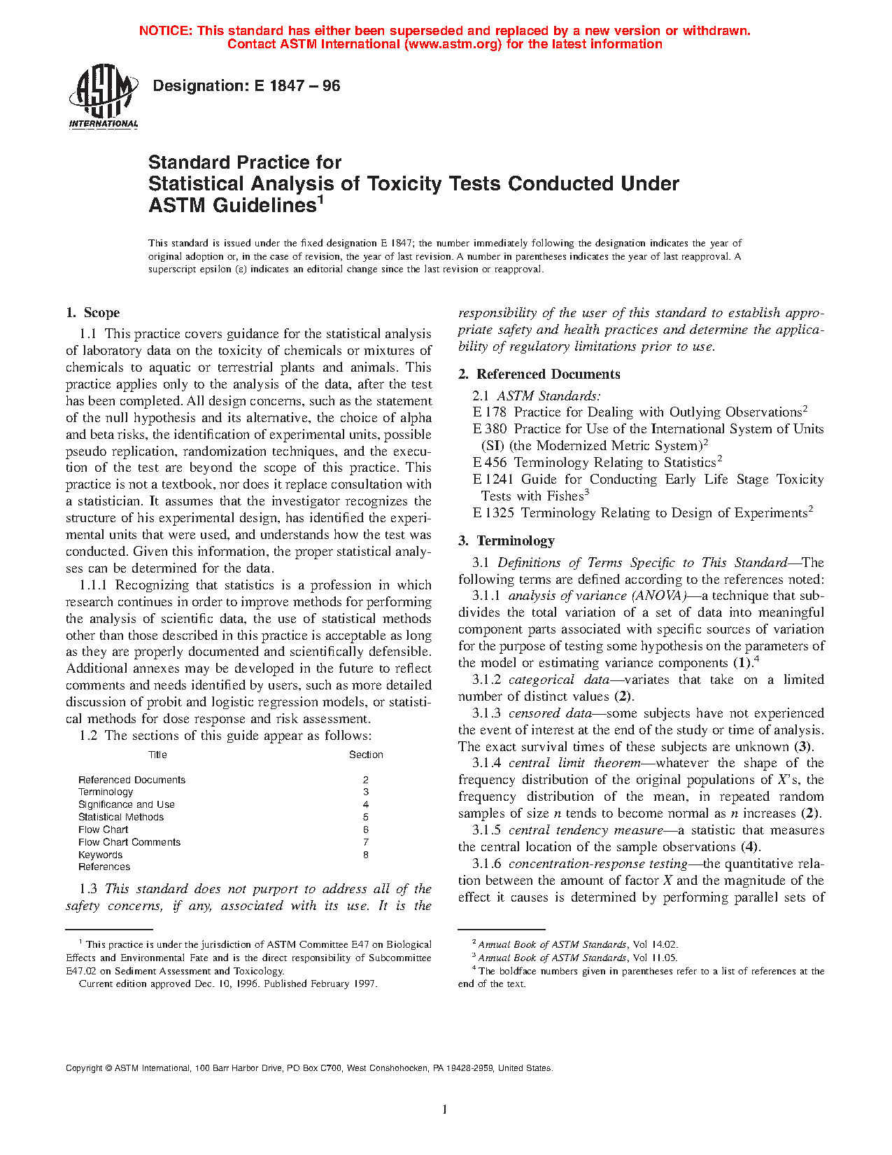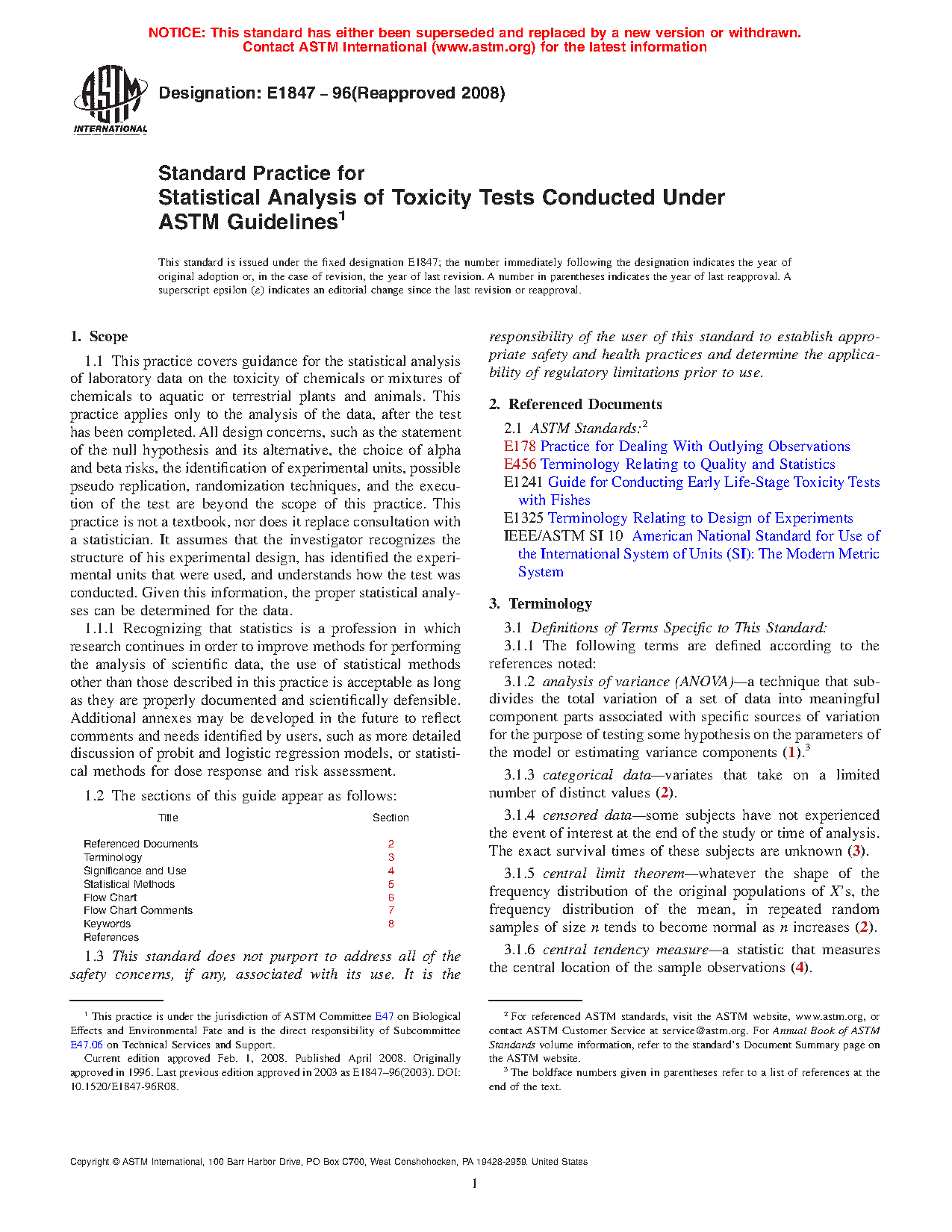 1.1 This practice covers guidance for the statistical analysis of laboratory data on the toxicity of chemicals or mixtures of chemicals to aquatic or terrestrial plants and animals. This practice applies only to the analysis of the data, after the test has been completed. All design concerns, such as the statement of the null hypothesis and its alternative, the choice of alpha and beta risks, the identification of experimental units, possible pseudo replication, randomization techniques, and the execution of the test are beyond the scope of this practice. This practice is not a textbook, nor does it replace consultation with a statistician. It assumes that the investigator recognizes the structure of his experimental design, has identified the experimental units that were used, and understands how the test was conducted. Given this information, the proper statistical analyses can be determined for the data.