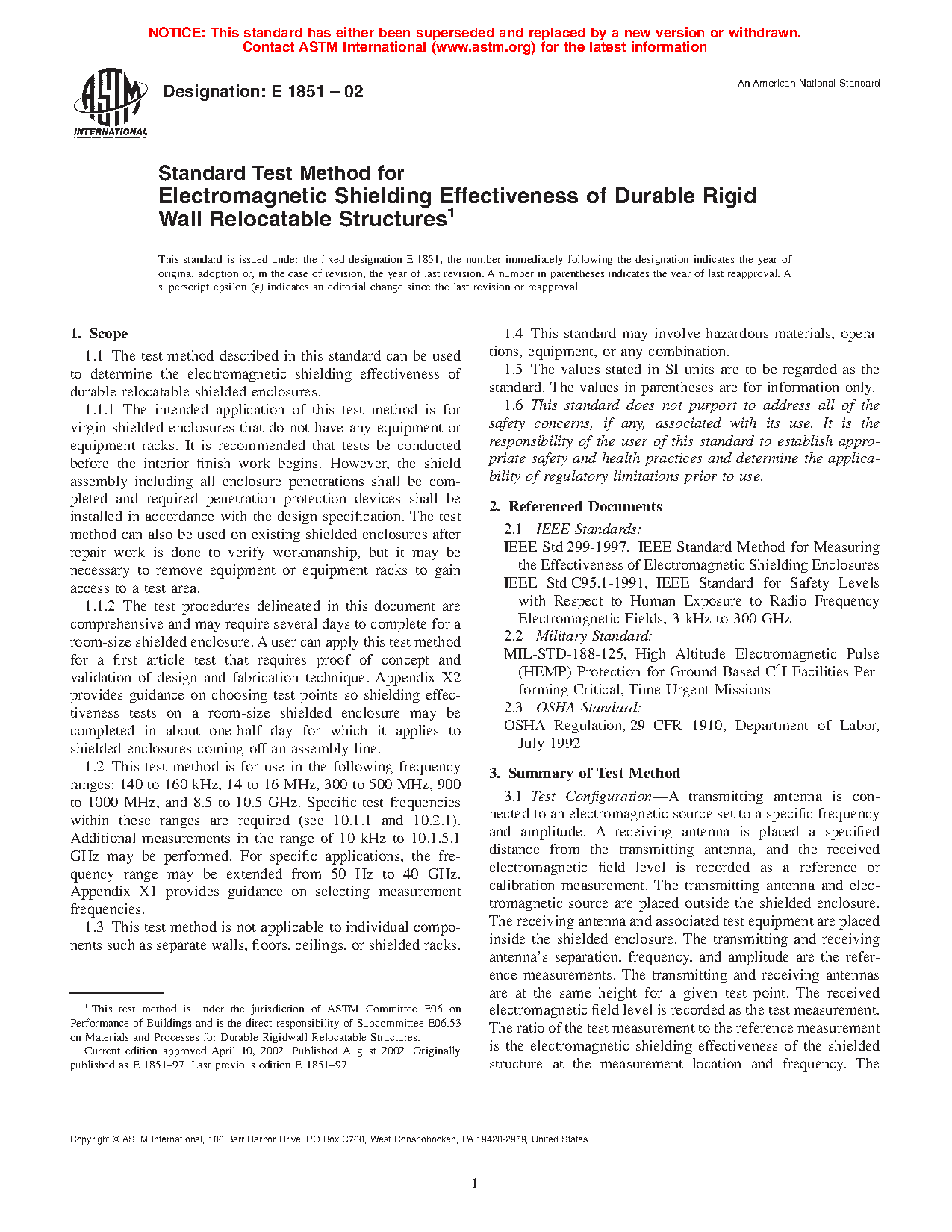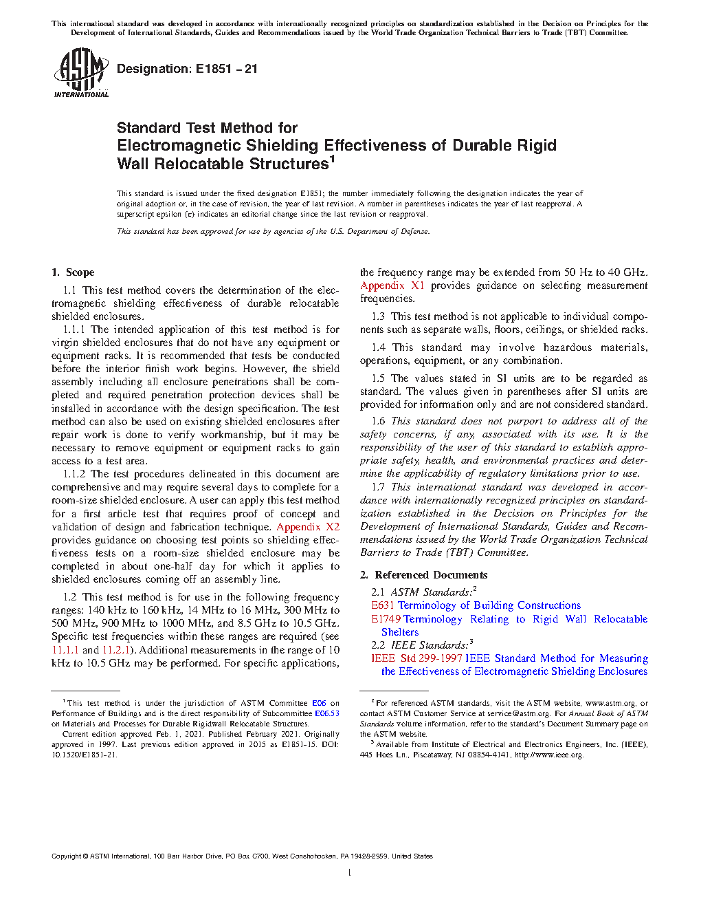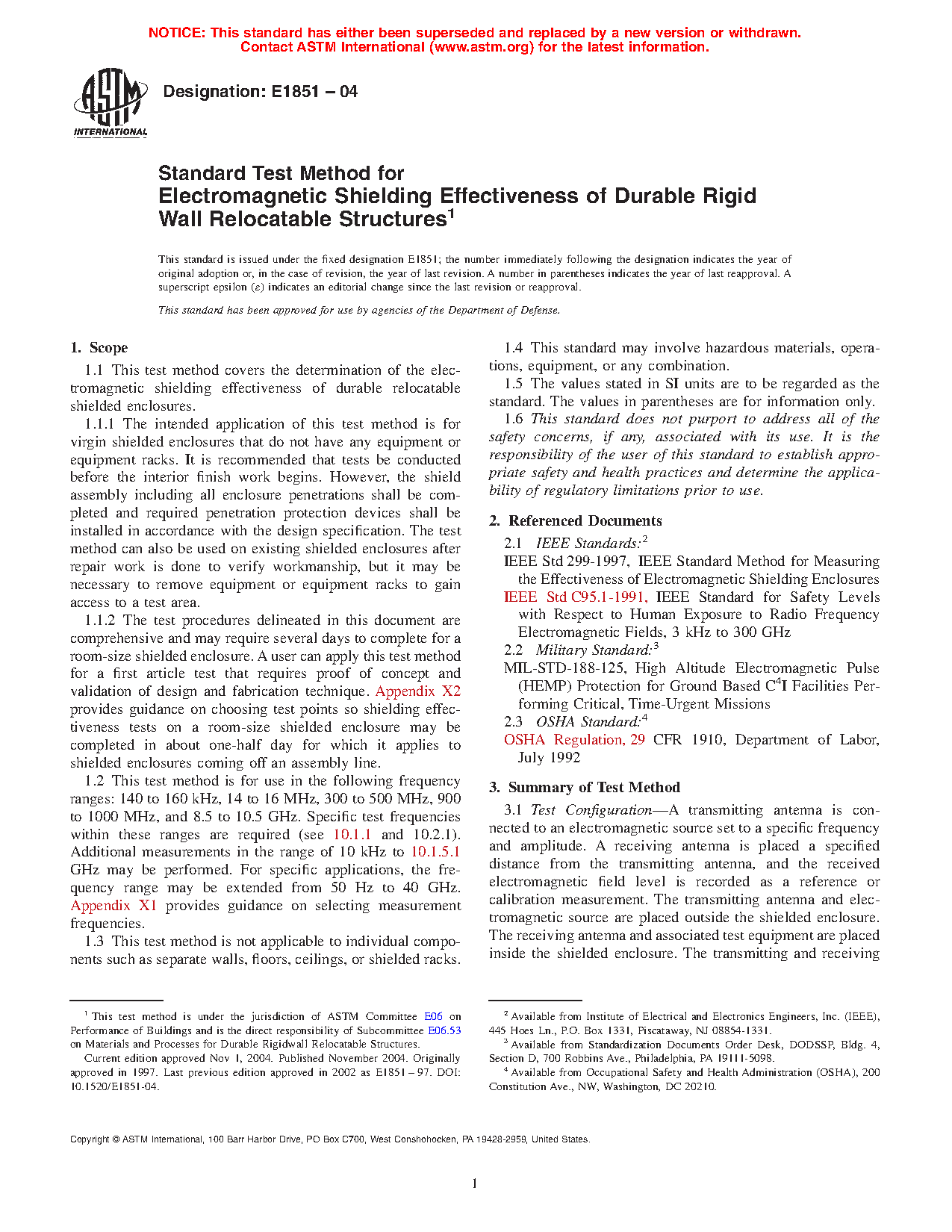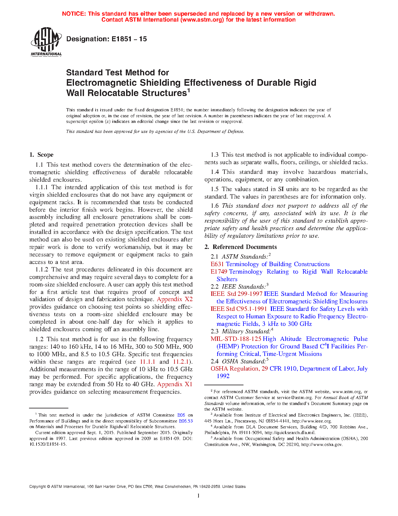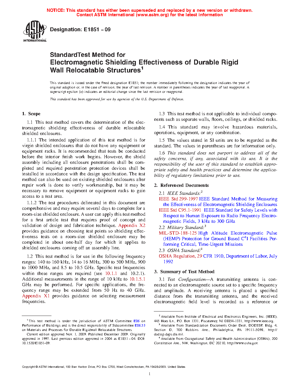 1.1 This test method covers the determination of the electromagnetic shielding effectiveness of durable relocatable shielded enclosures.