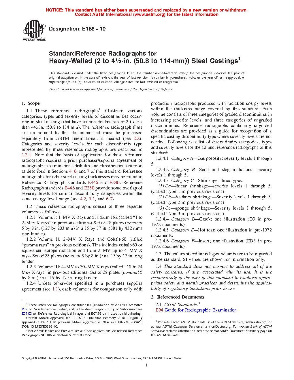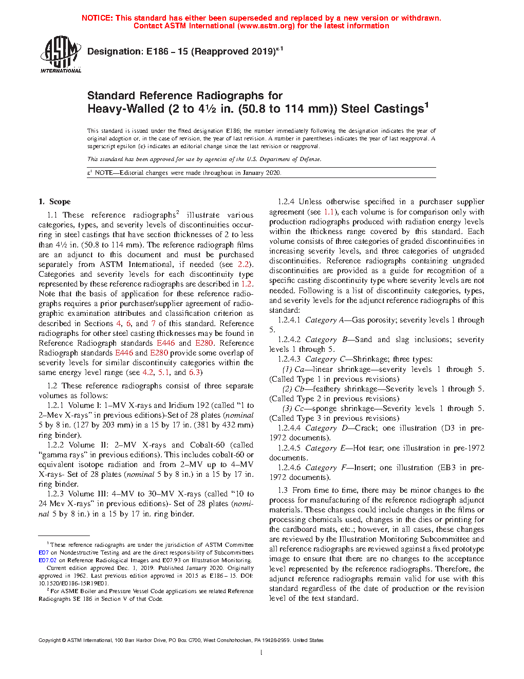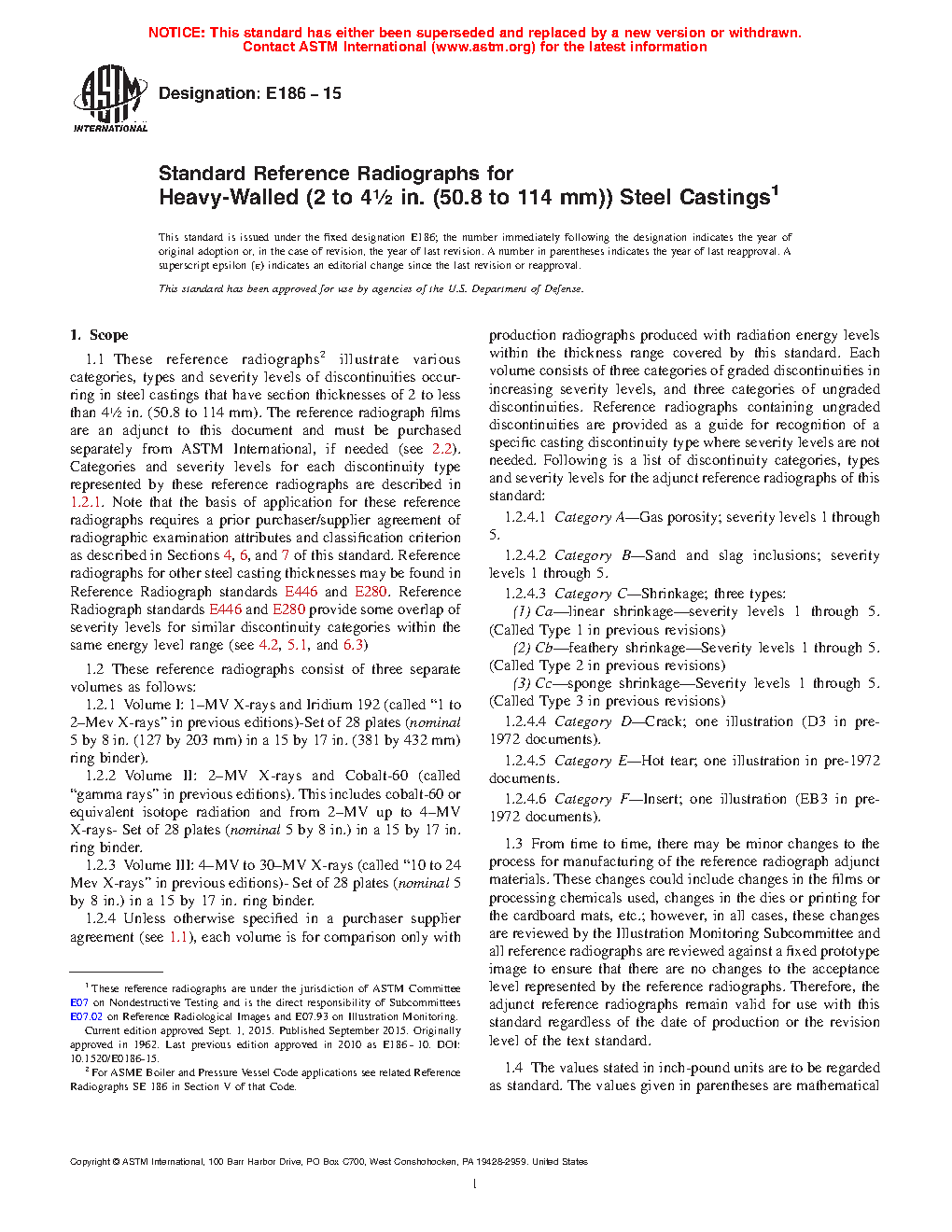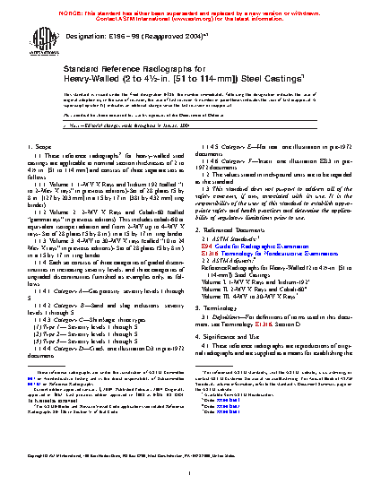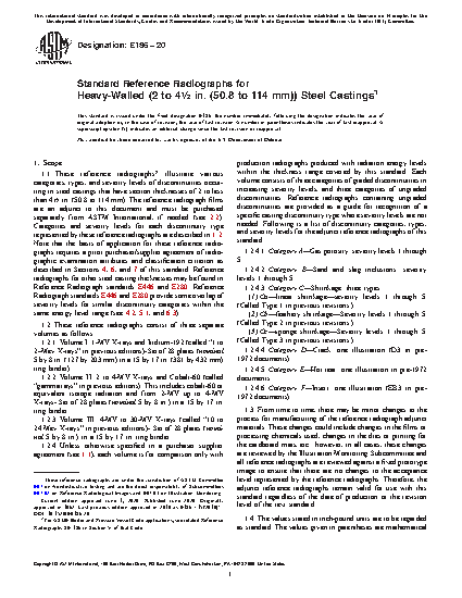 1.1 These reference radiographs for heavy-walled steel castings are applicable to nominal section thicknesses of 2 to 4 ½ in. [51 to 114 mm] and consists of three separate sets as follows: