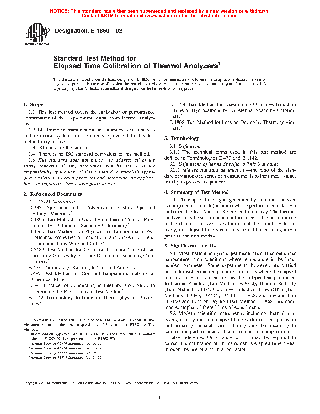 5.1 Most thermal analysis experiments are carried out under increasing temperature conditions where temperature is the independent parameter. Some experiments, however, are carried out under isothermal temperature conditions where the elapsed time to an event is measured as the independent parameter. Isothermal Kinetics (Test Methods E2070), Thermal Stability (Test Method E487), Oxidative Induction Time (OIT) (Test Methods D3895, D4565, D5483, E1858, and Specification D3350) and Loss-on-Drying (Test Methods E1868) are common examples of these kinds of experiments.