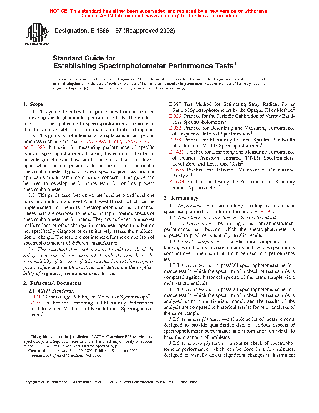 1.2 This guide is not intended as a replacement for specific practices such as Practices E275, E925, E932, E958, E1421, or E1683 that exist for measuring performance of specific types of spectrophotometers. Instead, this guide is intended to provide guidelines in how similar practices should be developed when specific practices do not exist for a particular spectrophotometer type, or when specific practices are not applicable due to sampling or safety concerns. This guide can be used to develop performance tests for on-line process spectrophotometers.