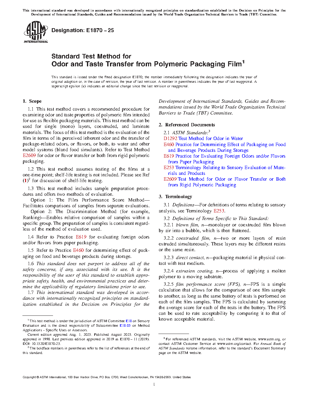 1.1 This test method covers a recommended procedure for examining odor and taste properties of polymeric film intended for use as flexible packaging materials. This test method can be used for single (mono) layers, coextruded, and laminate materials. The focus of this test method is the evaluation of the film in terms of its perceived inherent odor and the transfer of package-related odors, or flavors, or both, to water and other model systems (bland food simulants).