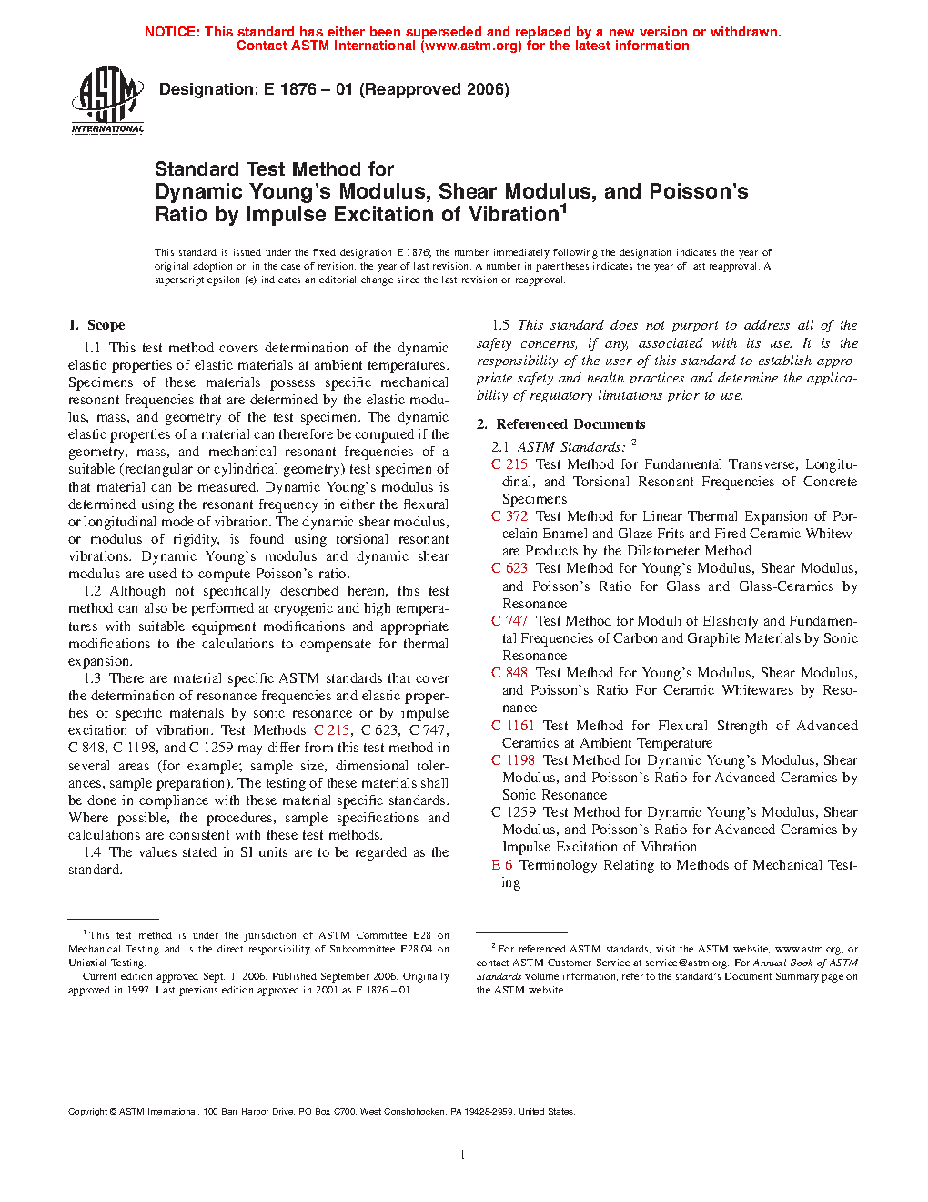 1.7 This test method shall not be used for establishing accurate dynamic Young’s modulus, dynamic shear modulus or Poisson’s ratio for materials that cannot be fabricated in uniform rectangular or cylindrical cross section.