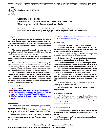 5.3 This practice is intended to provide an accelerated thermal endurance estimation in a fraction of the time require for oven-aging tests. The primary product of this practice is the thermal index (temperature) for a selected estimated thermal endurance (time) as derived from material decomposition.