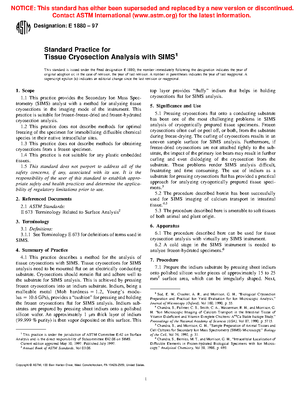 1.1 This practice provides the Secondary Ion Mass Spectrometry (SIMS) analyst with a method for analyzing tissue cryosections in the imaging mode of the instrument. This practice is suitable for frozen-freeze-dried and frozen-hydrated cryosection analysis.