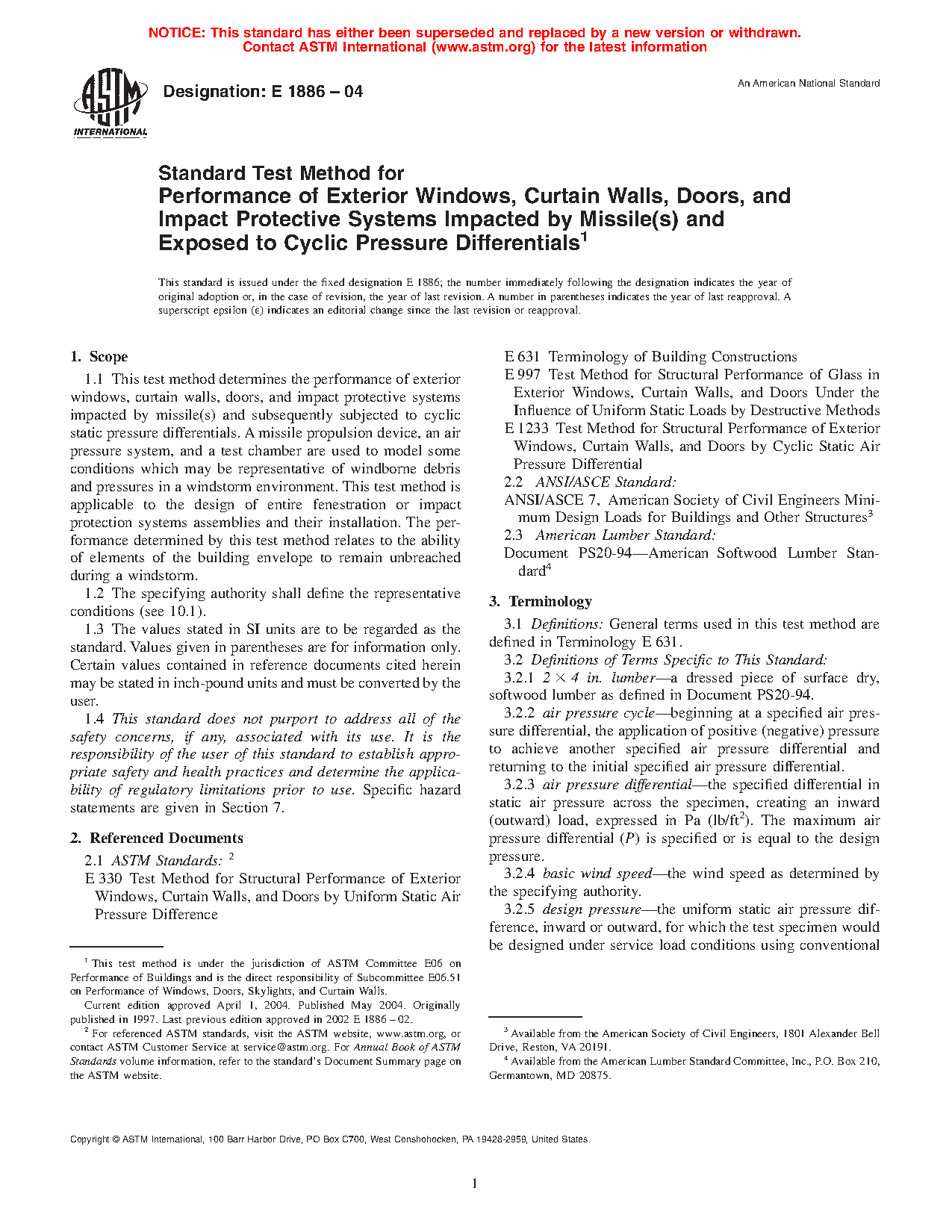 1.1 This test method covers the performance of exterior windows, curtain walls, doors, and impact protective systems impacted by missile(s) and subsequently subjected to cyclic static pressure differentials. A missile propulsion device, an air pressure system, and a test chamber are used to model some conditions which may be representative of windborne debris and pressures in a windstorm environment. This test method is applicable to the design of entire fenestration or impact protection systems assemblies and their installation. The performance determined by this test method relates to the ability of elements of the building envelope to remain unbreached during a windstorm.