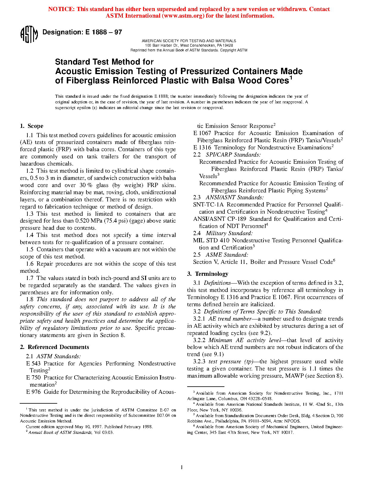 Standard Test Method for Acoustic Emission Testing of Pressurized Containers Made of Fiberglass Reinforced Plastic with Balsa Wood Cores
