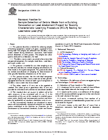 1.1 This guide describes a method for selecting samples of building components coated with paints suspected of containing lead. The samples are collected from the debris waste stream created during demolition, renovation, lead hazard control, or abatement projects. The samples are subsequently analyzed in the laboratory for lead.