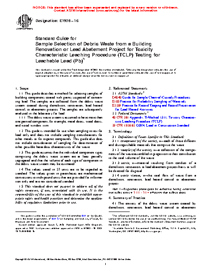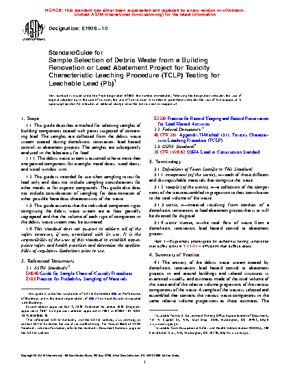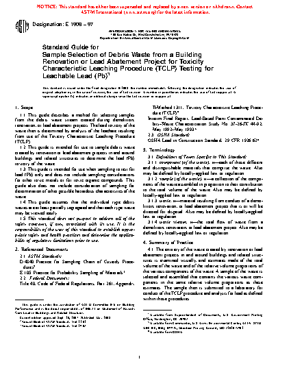 1.1 This guide describes a method for selecting samples of building components coated with paints suspected of containing lead. The samples are collected from the debris waste stream created during demolition, renovation, lead hazard control, or abatement projects. The samples are subsequently analyzed in the laboratory for lead.