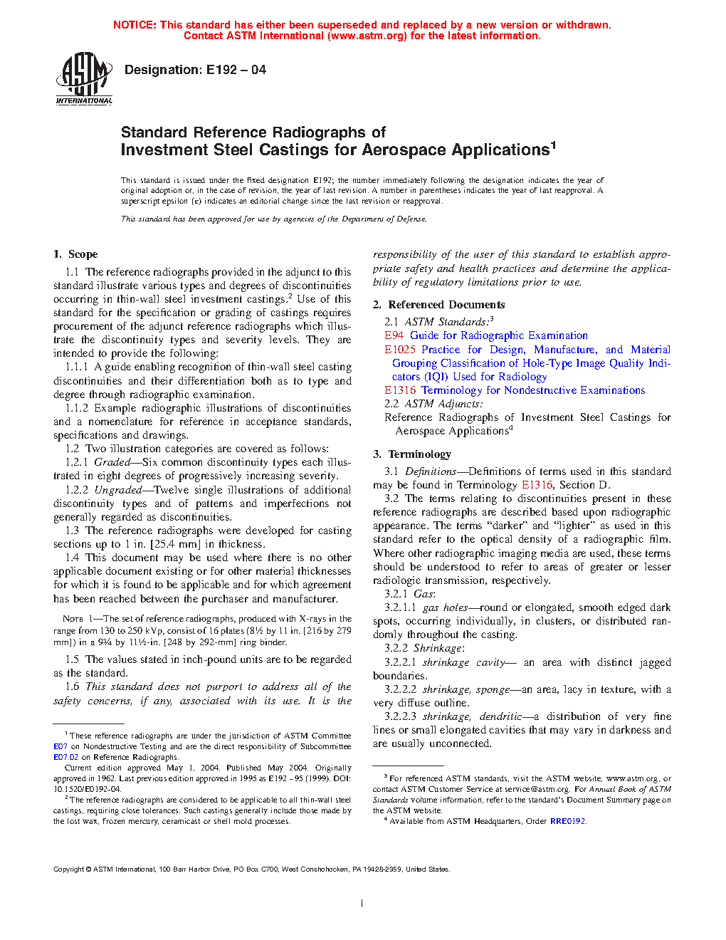 1.1.2 Example radiographic illustrations of discontinuities and a nomenclature for reference in acceptance standards, specifications, and drawings.