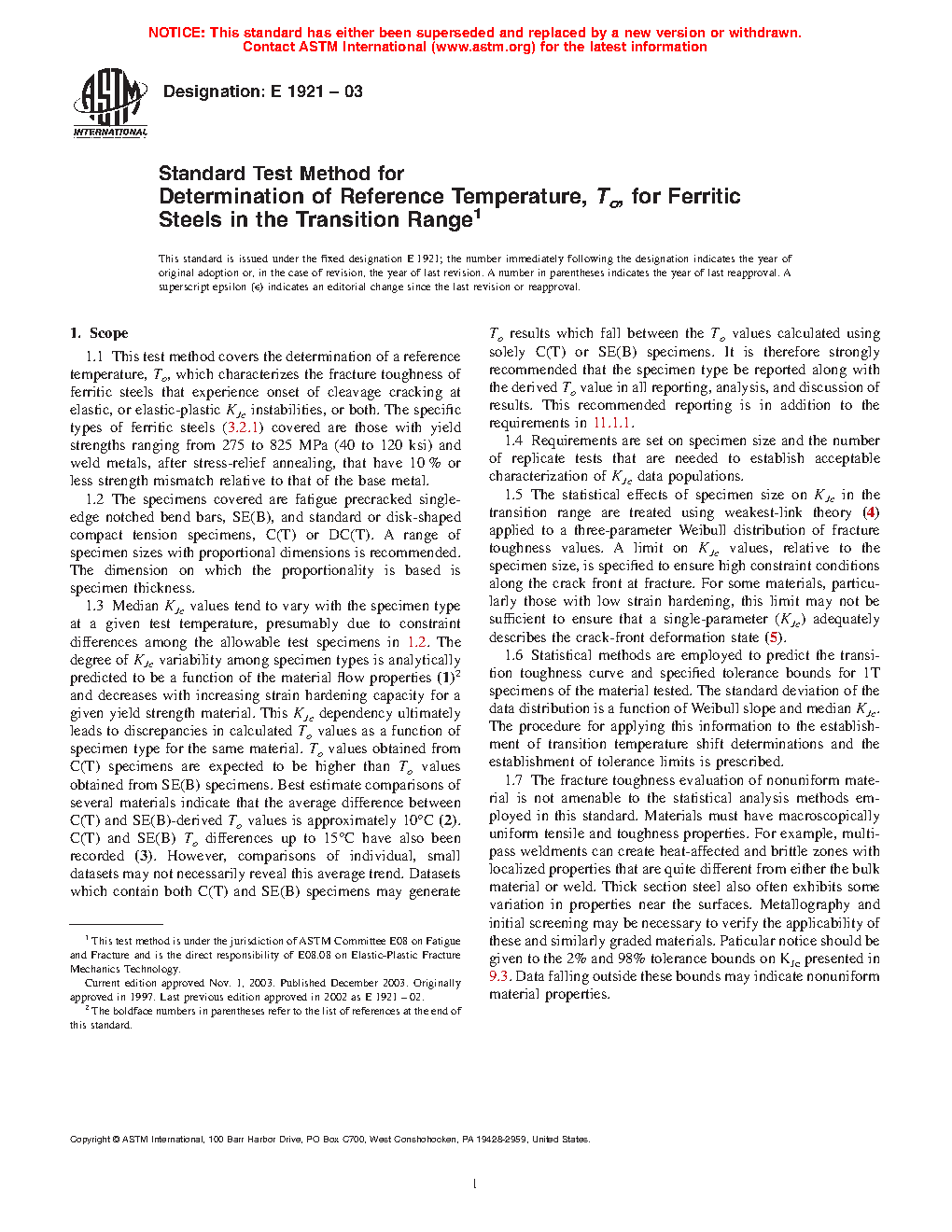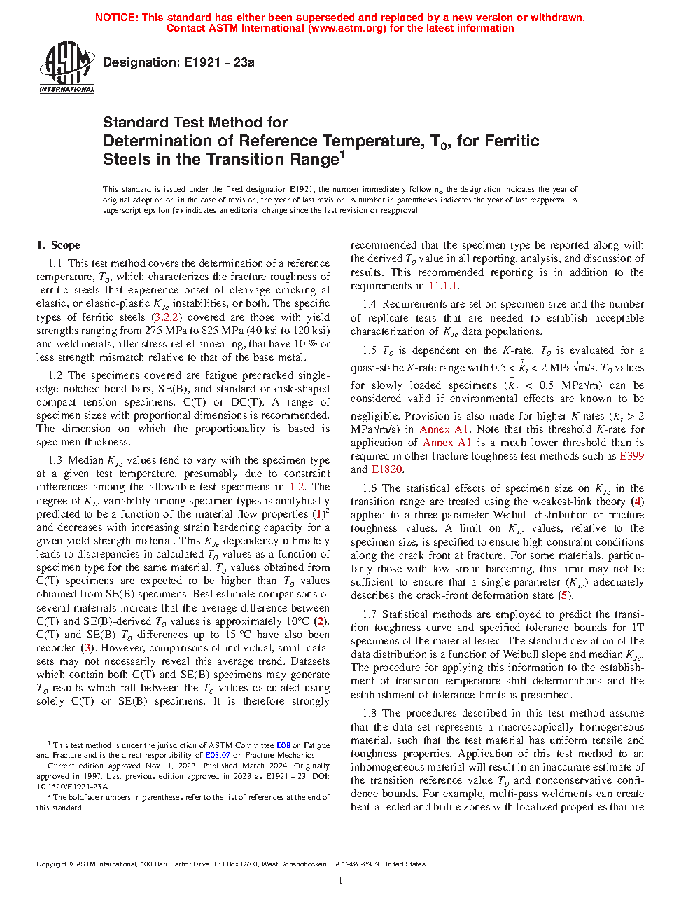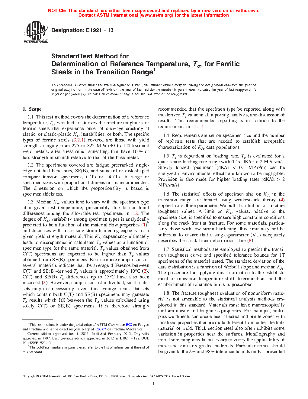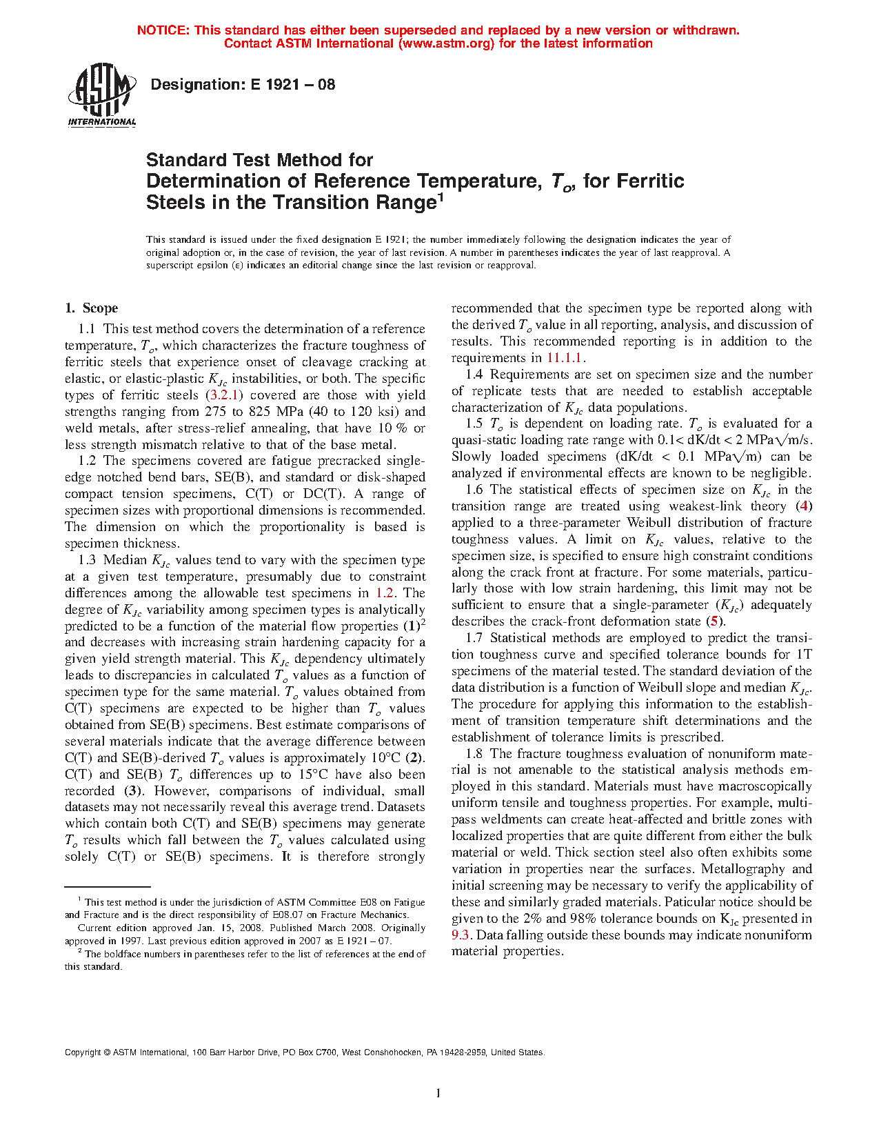 1.3 Median KJc values tend to vary with the specimen type at a given test temperature, presumably due to constraint differences among the allowable test specimens in 1.2. The degree of KJc variability among specimen types is analytically predicted to be a function of the material flow properties (1)2 and decreases with increasing strain hardening capacity for a given yield strength material. This KJc dependency ultimately leads to discrepancies in calculated To values as a function of specimen type for the same material. To values obtained from C(T) specimens are expected to be higher than To values obtained from SE(B) specimens. Best estimate comparisons of several materials indicate that the average difference between C(T) and SE(B)-derived To values is approximately 10°C (2). C(T) and SE(B) To differences up to 15 °C have also been recorded (3). However, comparisons of individual, small datasets may not necessarily reveal this average trend. Datasets which contain both C(T) and SE(B) specimens may generate To results which fall between the To values calculated using solely C(T) or SE(B) specimens. It is therefore strongly recommended that the specimen type be reported along with the derived To value in all reporting, analysis, and discussion of results. This recommended reporting is in addition to the requirements in 11.1.1.