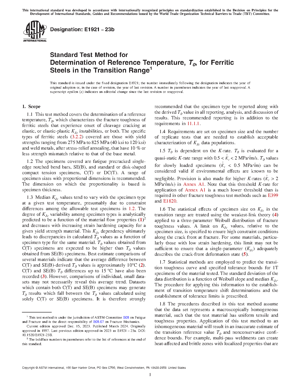 1.1 This test method covers the determination of a reference temperature, To, which characterizes the fracture toughness of ferritic steels that experience onset of cleavage cracking at elastic, or elastic-plastic KJc instabilities, or both. The specific types of ferritic steels (3.2.2) covered are those with yield strengths ranging from 275 to 825 MPa (40 to 120 ksi) and weld metals, after stress-relief annealing, that have 10 % or less strength mismatch relative to that of the base metal.