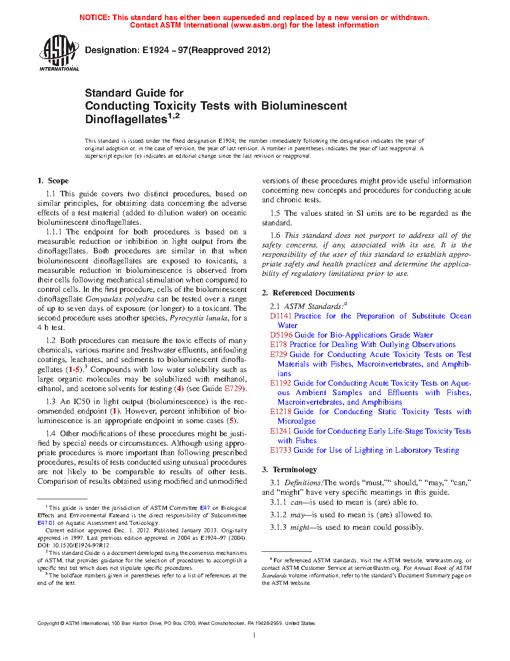 1.1 This guide covers two distinct procedures, based on similar principles, for obtaining data concerning the adverse effects of a test material (added to dilution water) on oceanic bioluminescent dinoflagellates.