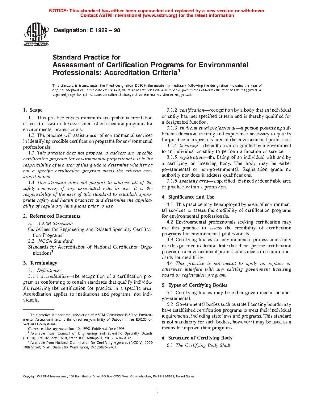 1.3 This practice does not propose to address any specific certification program for environmental professionals. It is the responsibility of the user of this guide to determine whether or not a specific certification program meets the criteria contained herein.