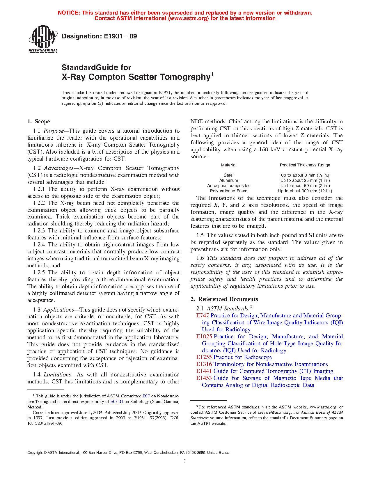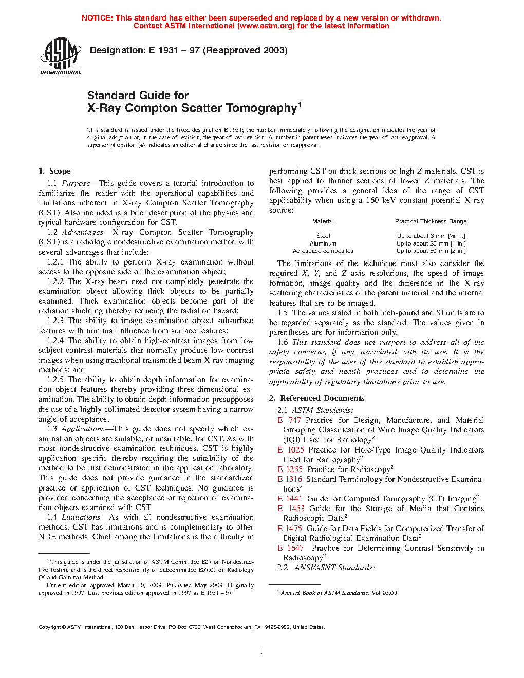1.4 Limitations—As with all nondestructive examination methods, CST has limitations and is complementary to other NDE methods. Chief among the limitations is the difficulty in performing CST on thick sections of high-Z materials. CST is best applied to thinner sections of lower Z materials. The following provides a general idea of the range of CST applicability when using a 160 keV constant potential X-ray source: