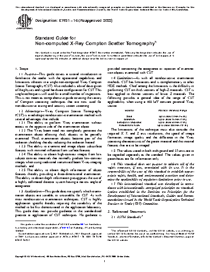 1.1 Purpose—This guide covers a tutorial introduction to familiarize the reader with the operational capabilities and limitations inherent in a single non-computed X-ray Compton Scatter Tomography (CST). Also included is a brief description of the physics and typical hardware configuration for CST. This single technique is still used for a small number of inspections. This is not meant as comprehensive guide covering the variety of Compton scattering techniques that are now used for non-destructive testing and security screen screening.