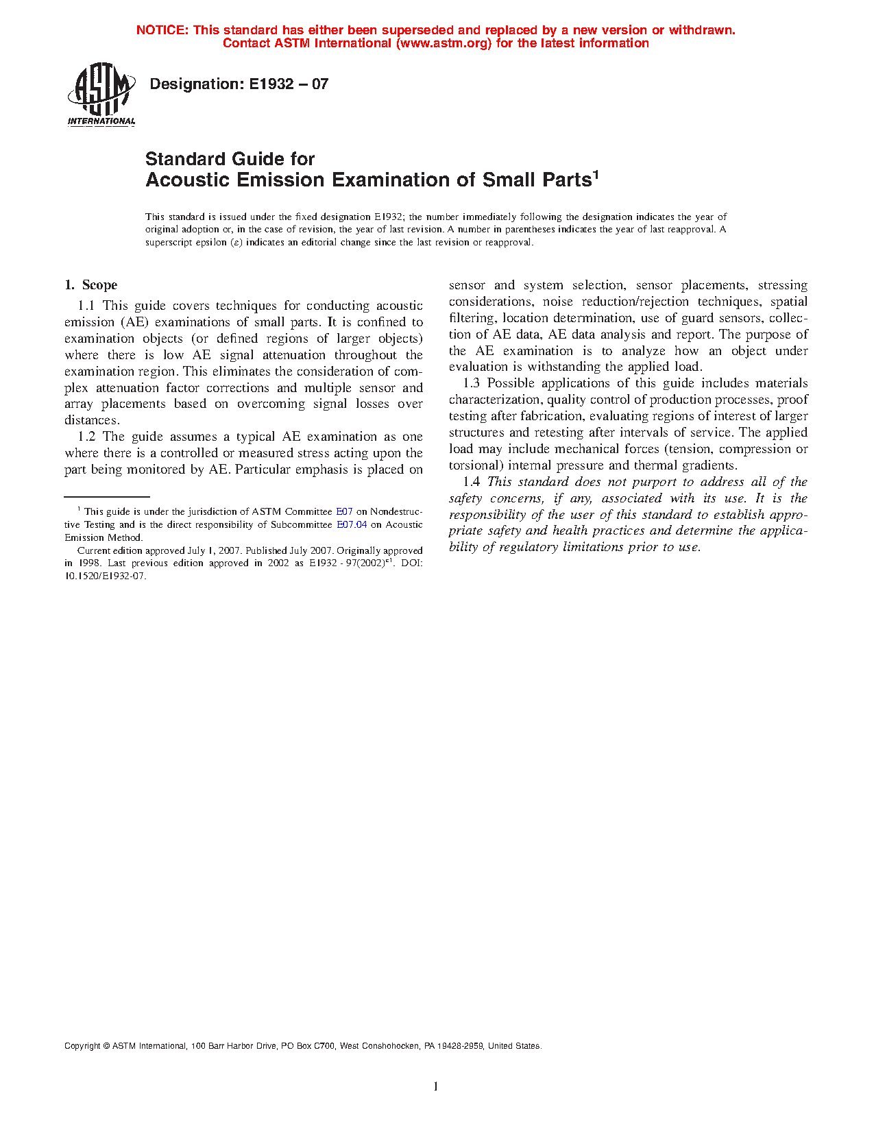 1.1 This guide covers techniques for conducting acoustic emission (AE) examinations of small parts. It is confined to examination objects (or defined regions of larger objects) where there is low AE signal attenuation throughout the examination region. This eliminates the consideration of complex attenuation factor corrections and multiple sensor and array placements based on overcoming signal losses over distances.
