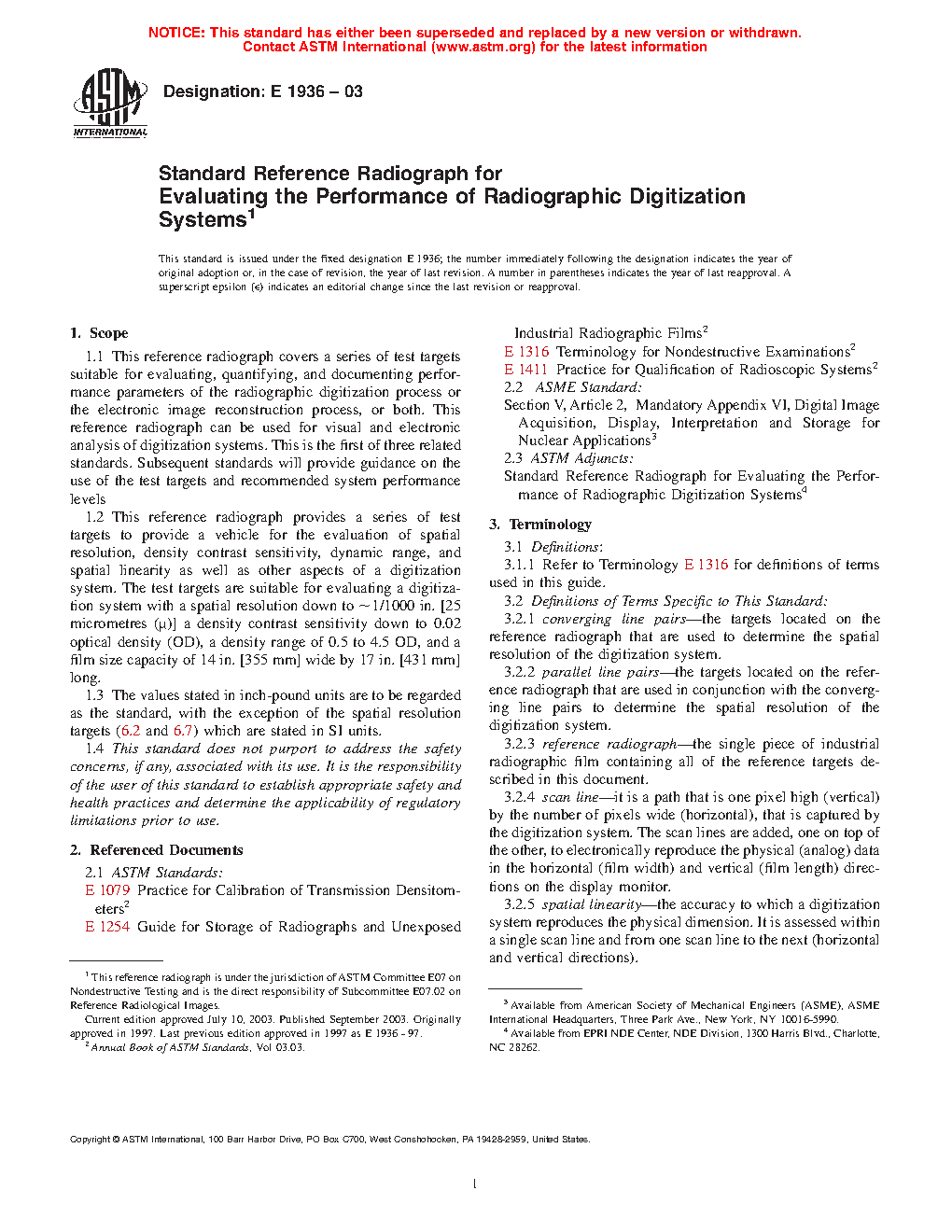1.2 This reference radiograph provides a series of test targets to provide a vehicle for the evaluation of spatial resolution, density contrast sensitivity, dynamic range, and spatial linearity, as well as other aspects of a digitization system. The test targets are suitable for evaluating a digitization system with a spatial resolution down to ~1/1000 in. (25 micrometres (µm)), a density contrast sensitivity down to 0.02 optical density (OD), a density range of 0.5 to 4.5 OD, and a film size capacity of 14 in. (355 mm) wide by 17 in. (431 mm) long.