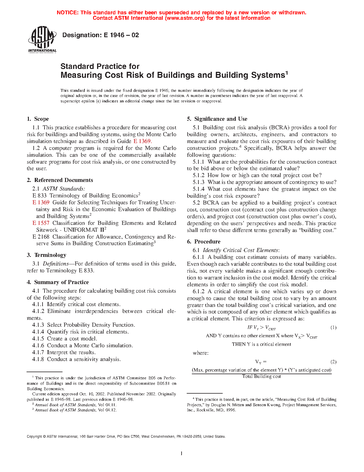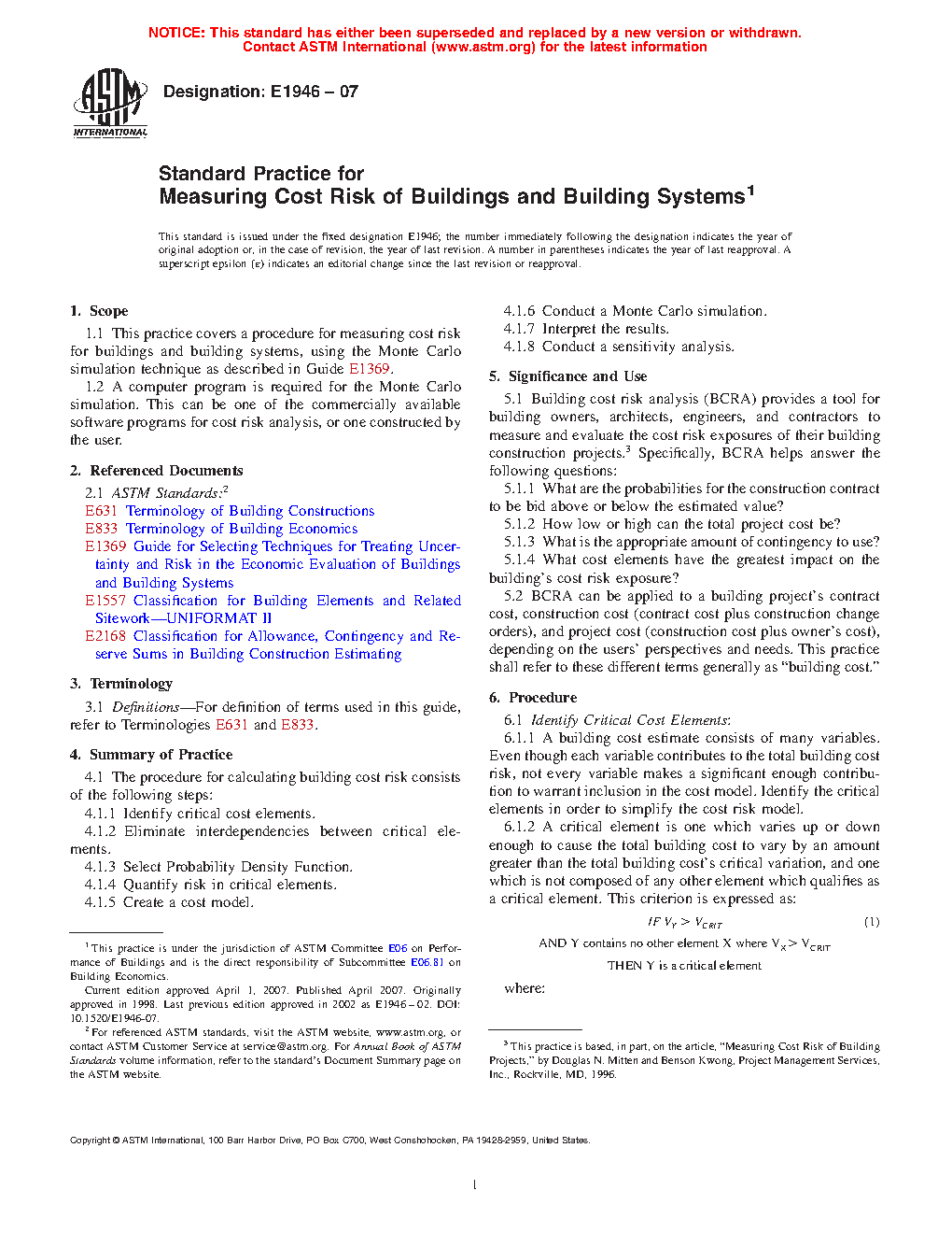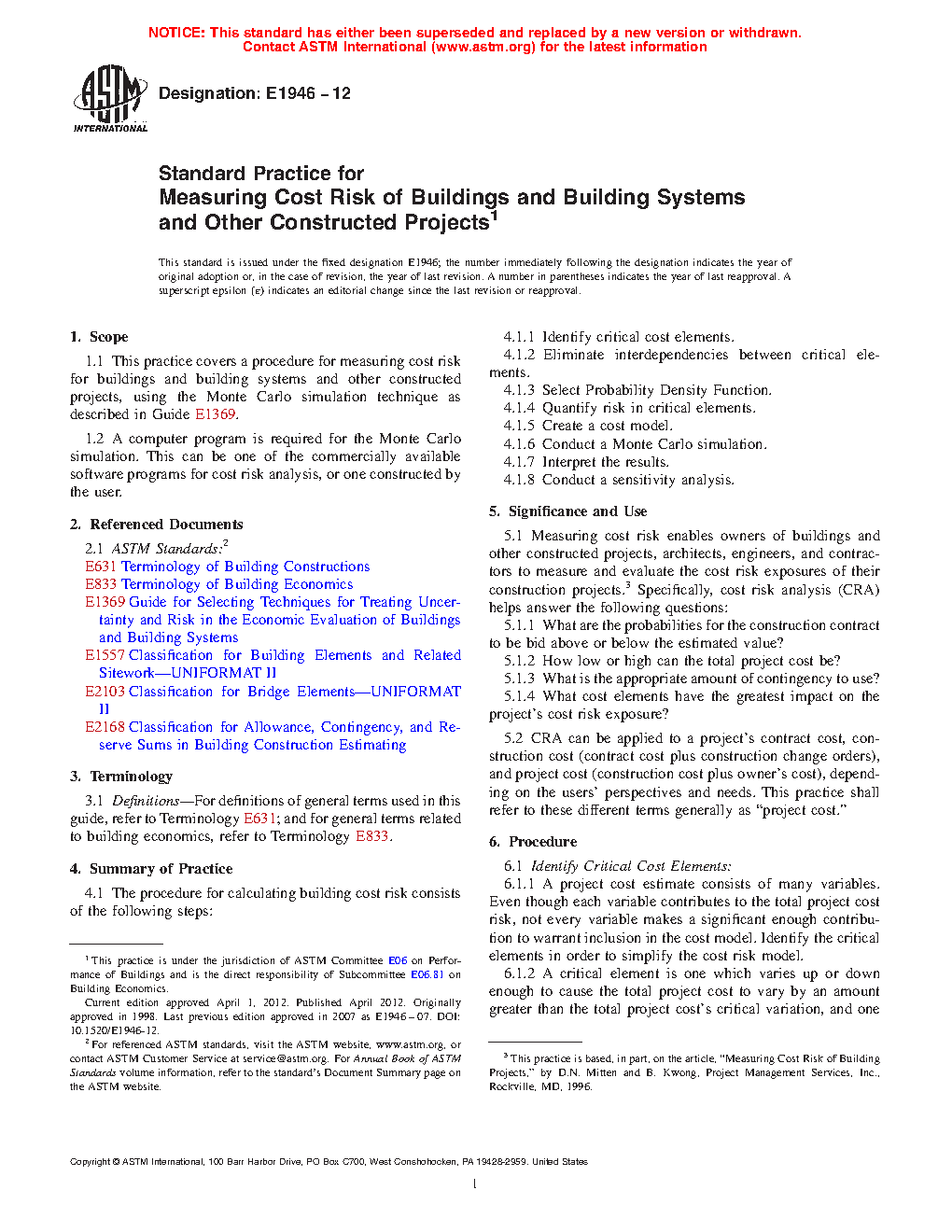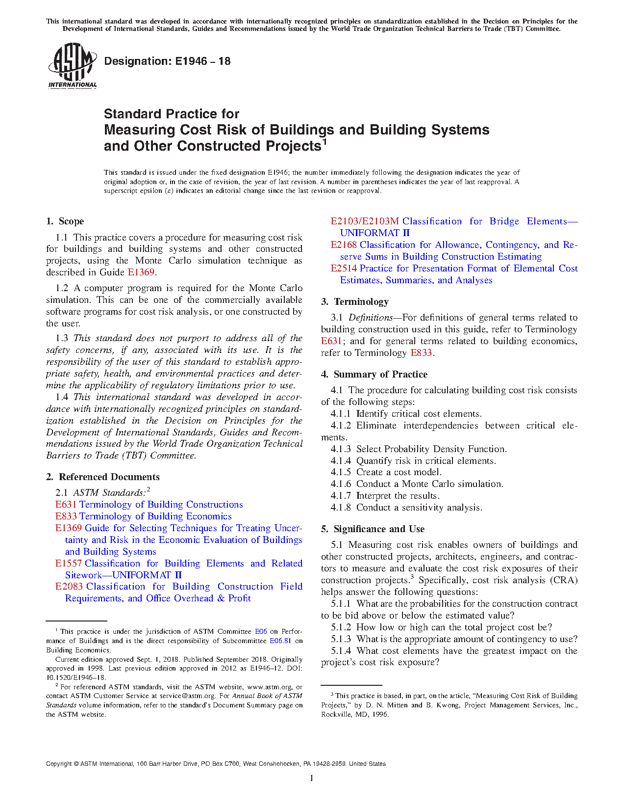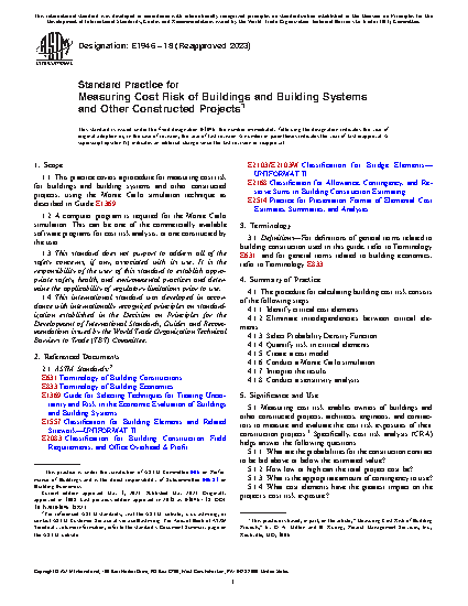 1.1 This practice covers a procedure for measuring cost risk for buildings and building systems and other constructed projects, using the Monte Carlo simulation technique as described in Guide E1369.