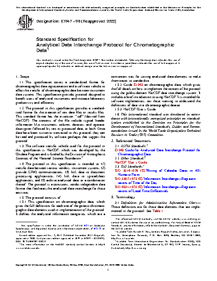 1.1 This specification covers a standardized format for chromatographic data representation and a software vehicle to effect the transfer of chromatographic data between instrument data systems. This specification provides protocol designed to benefit users of analytical instruments and increase laboratory productivity and efficiency.