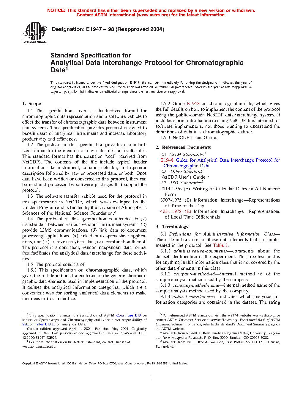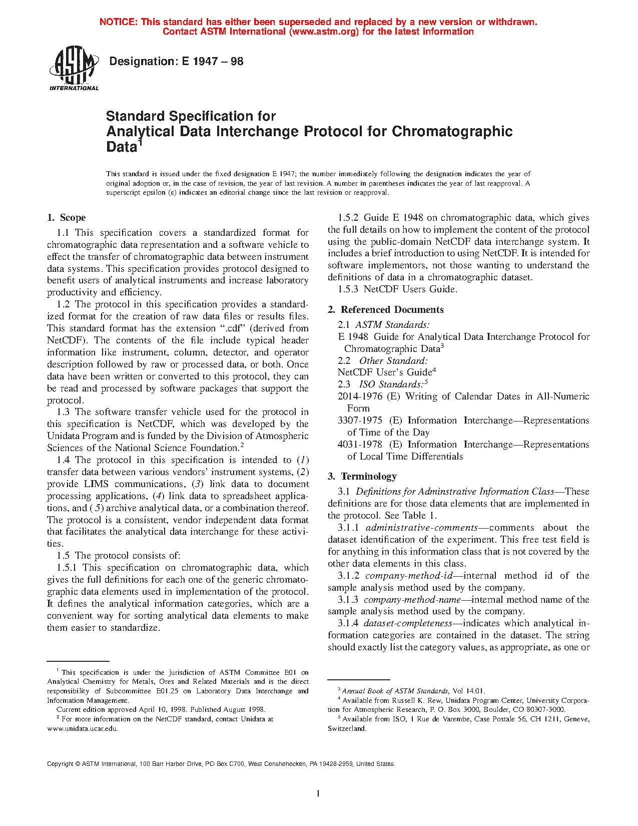 1.5.2 Guide E1948 on chromatographic data, which gives the full details on how to implement the content of the protocol using the public-domain NetCDF data interchange system. It includes a brief introduction to using NetCDF. It is intended for software implementors, not those wanting to understand the definitions of data in a chromatographic dataset.