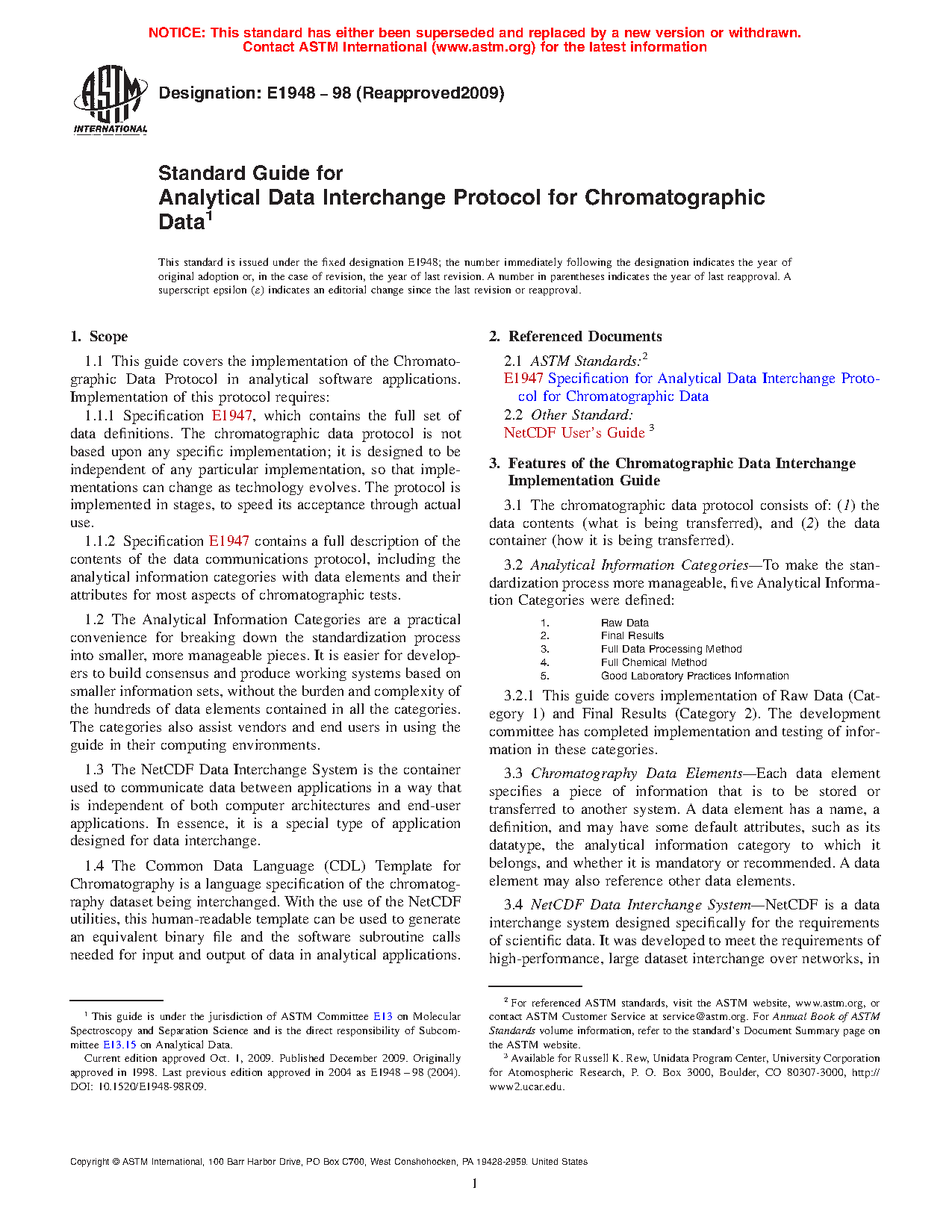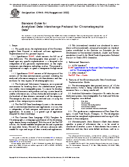 1.1.1 Specification E1947, which contains the full set of data definitions. The chromatographic data protocol is not based upon any specific implementation; it is designed to be independent of any particular implementation, so that implementations can change as technology evolves. The protocol is implemented in stages, to speed its acceptance through actual use.