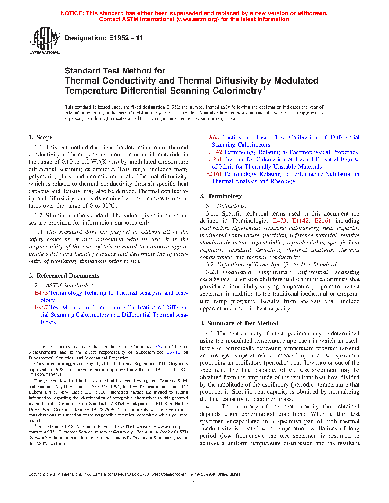 1.1 This test method covers the determination of thermal conductivity of homogeneous, non-porous solid materials in the range of 0.10 to 1.0 W/(K*m) by modulated temperature differential scanning calorimeter. This range includes many polymeric, glass, and ceramic materials. Thermal diffusivity, which is elated to thermal conductivity through specific heat capacity and density, may also be derived. Thermal conductivity and diffusivity can be determined at one or more temperatures over the range of 0 to 90°C.