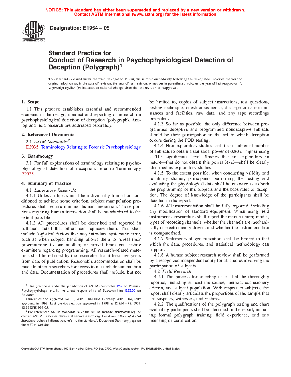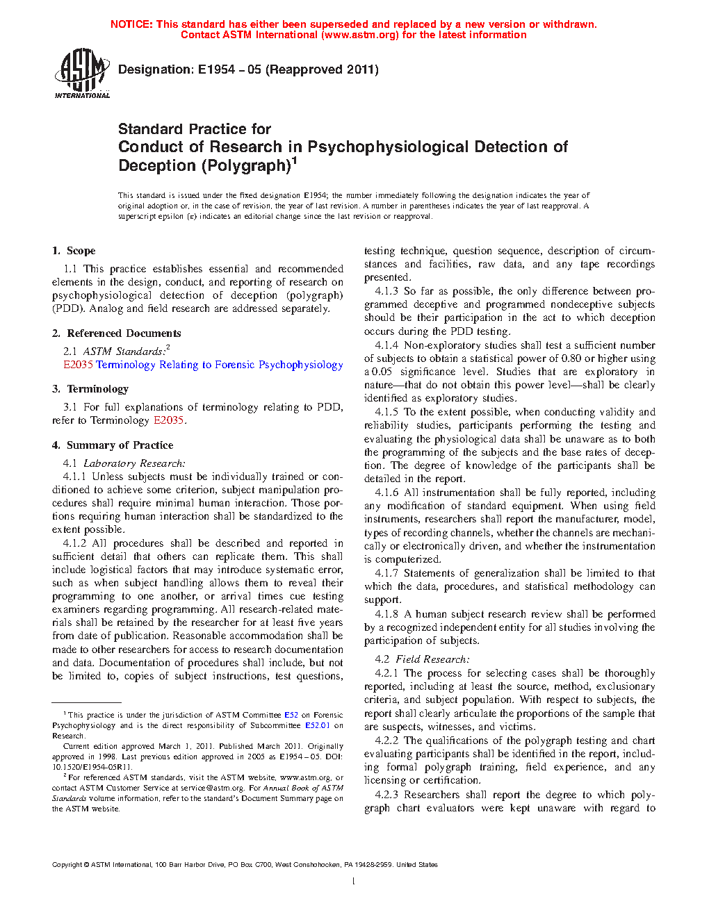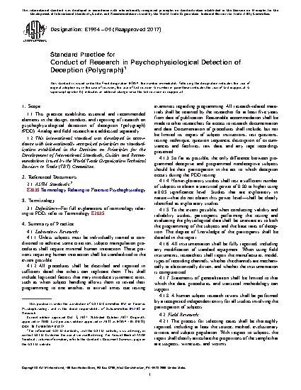 This practice establishes essential and renumbered elements in the design, conduct, and reporting of research (both laboratory and field) on the psychophysiological detection of deception (polygraph). In laboratory research, all procedures shall be documented in sufficient detail such that others can replicate them. Subject manipulation shall require minimal human interaction; however, when human interaction is deemed necessary, such procedure shall be standardized to the extent possible. Also, when studies of exploratory nature are conducted, they shall be clearly identified as exploratory studies. In field research, on the other hand, the procedure for case selection shall be reported in sufficient detail, including the qualifications of the polygraph testing and chart evaluating participants. In cases where departures from conventional field practice are encountered, these shall be documented in sufficient detail including an explanation for the nonstandard procedures. For both laboratory and field research, statements of generalization shall be limited to those which can be supported by data, procedures, and statistical methodology. Polygraph testing shall be carried out in terms of evidentiary psychophysiological detection of deception (PDD) examinations and investigative PDD examinations, the validity and utility of which shall conform to the requirements specified. Investigative PDD examinations may resort to a "successive hurdles" approach to satisfy the minimum validity requirements.