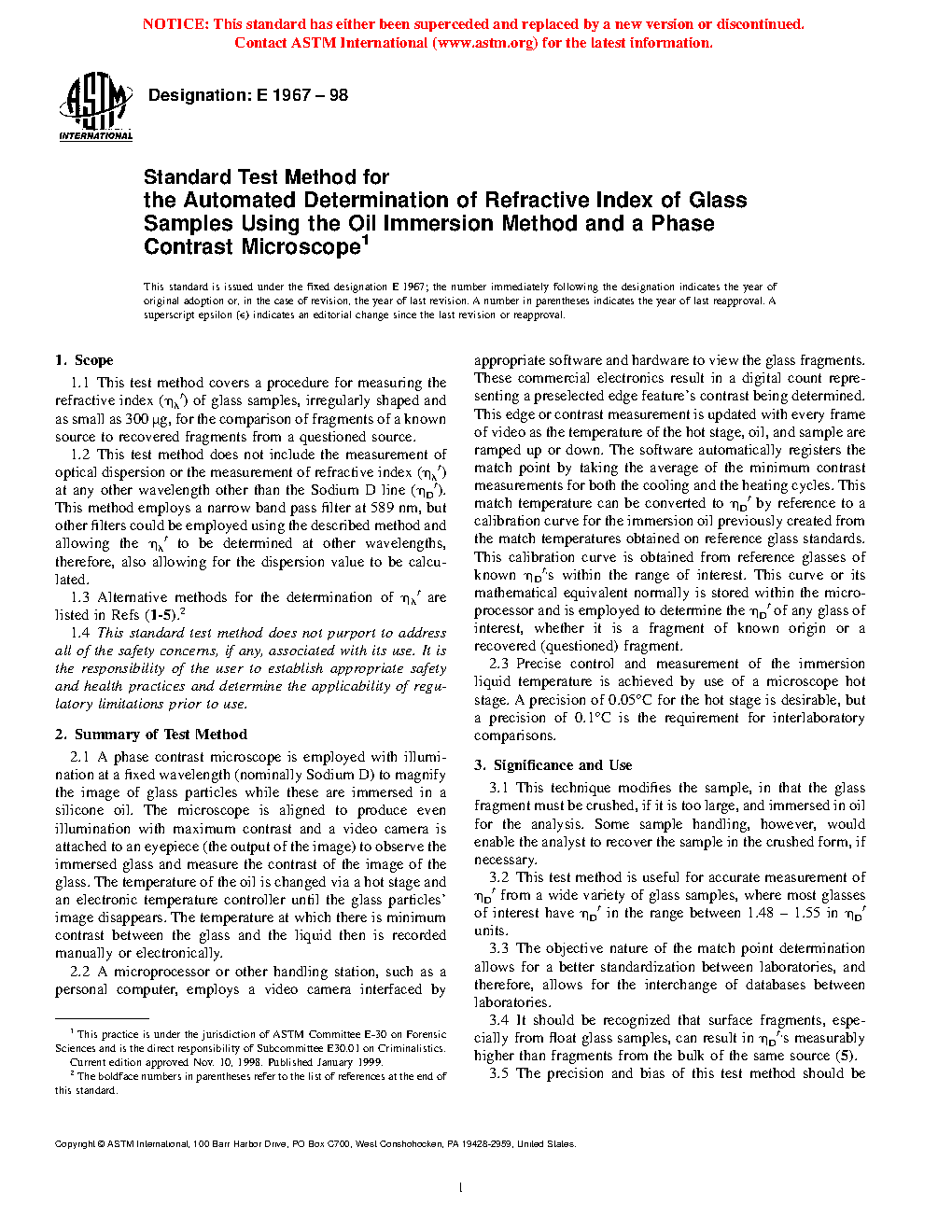 1.2 This test method does not include the measurement of optical dispersion or the measurement of refractive index (ηλt) at any other wavelength other than the Sodium D line (ηDt). This method employs a narrow band pass filter at 589 nm, but other filters could be employed using the described method and allowing the ηλt to be determined at other wavelengths, therefore, also allowing for the dispersion value to be calculated.