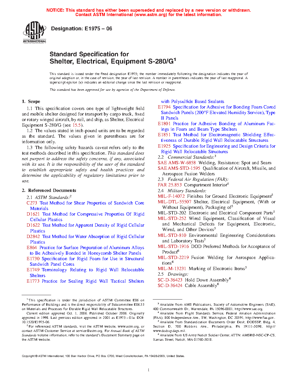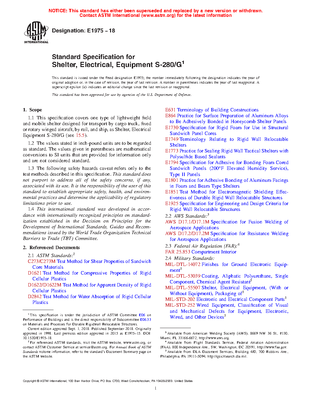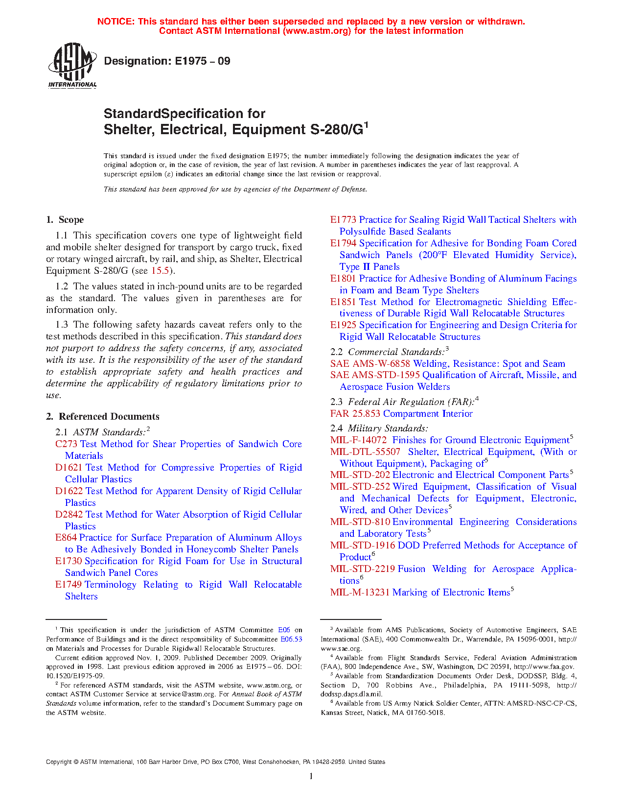 1.1 This specification covers one type of lightweight field and mobile shelter designed for transport by cargo truck, fixed or rotary winged aircraft, by rail, and ship, as Shelter, Electrical Equipment S-280/G (see 15.5).