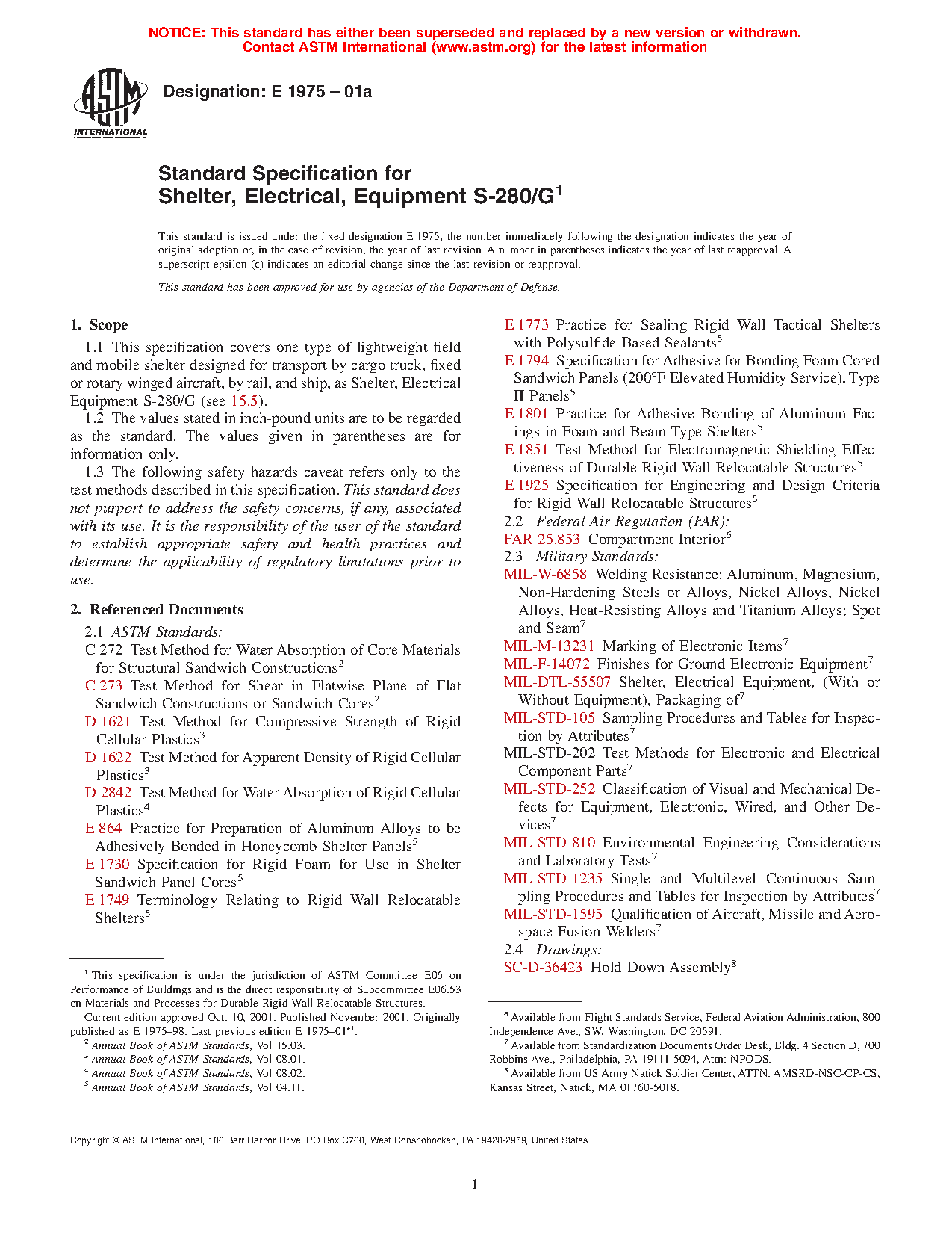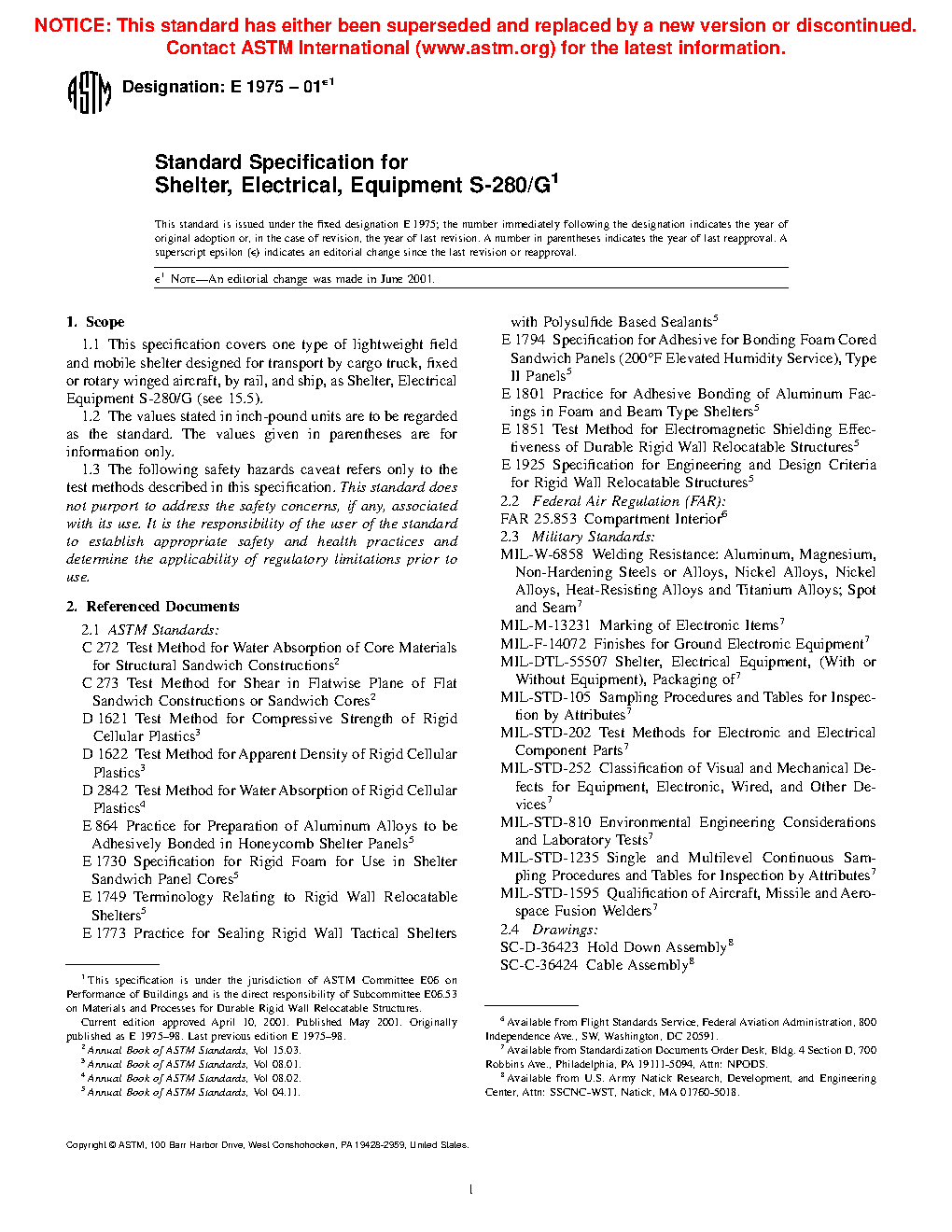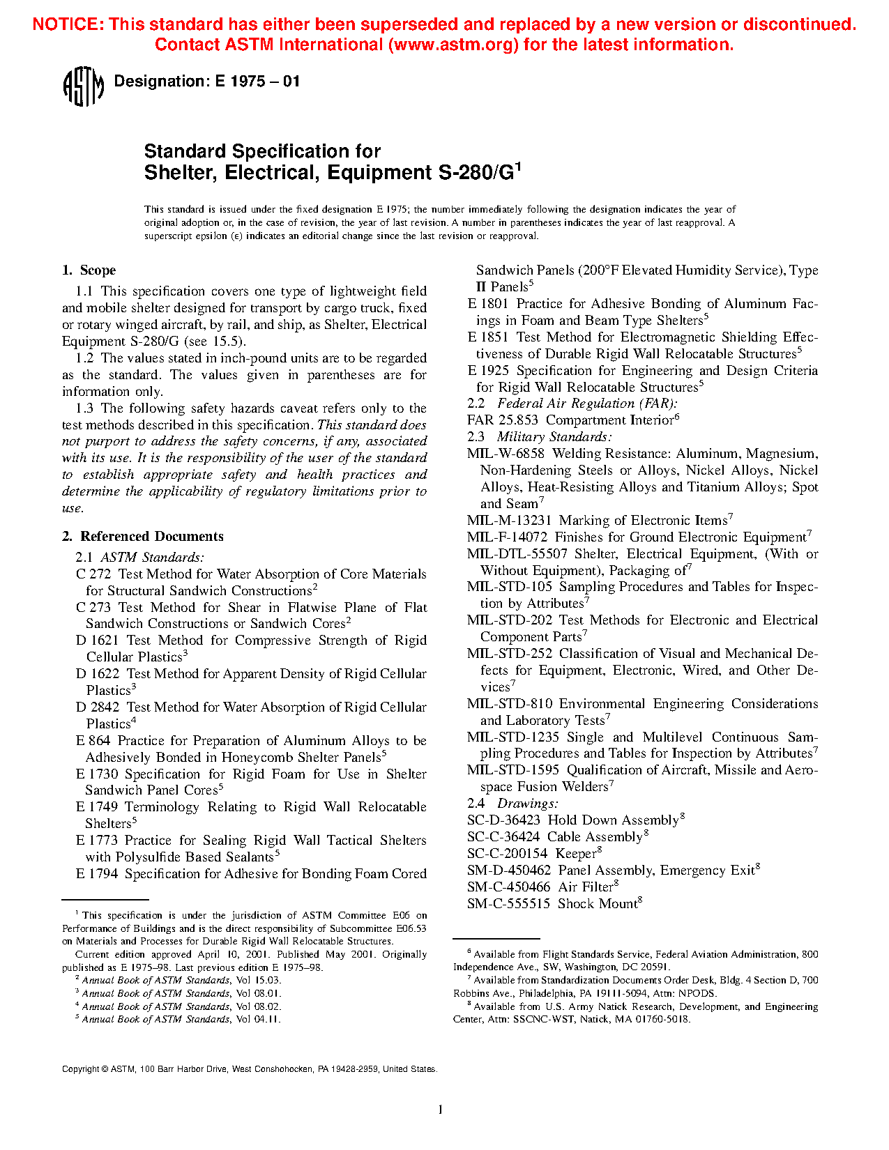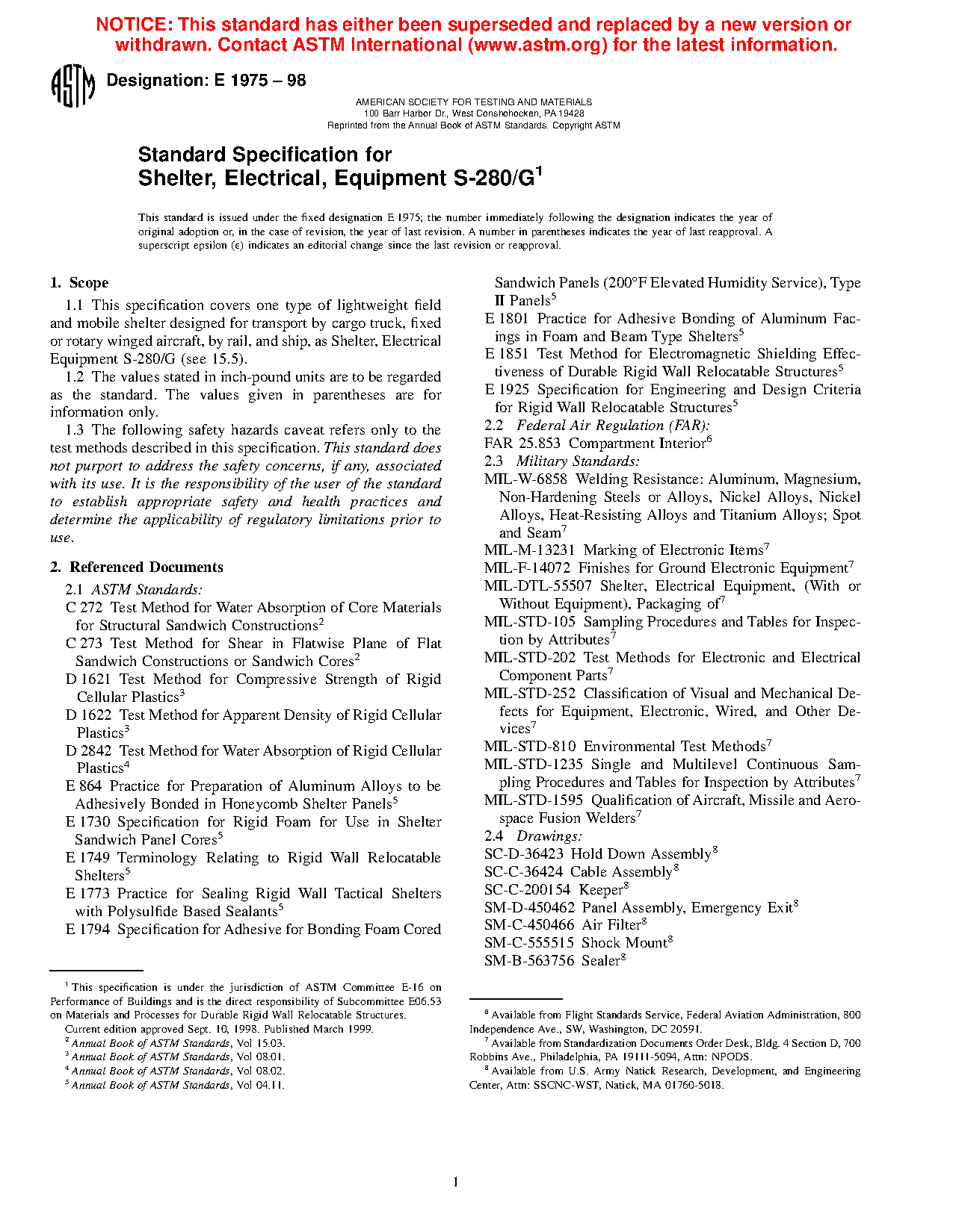 1.1 This specification covers one type of lightweight field and mobile shelter designed for transport by cargo truck, fixed or rotary winged aircraft, by rail, and ship, as Shelter, Electrical Equipment S-280/G (see 15.5).