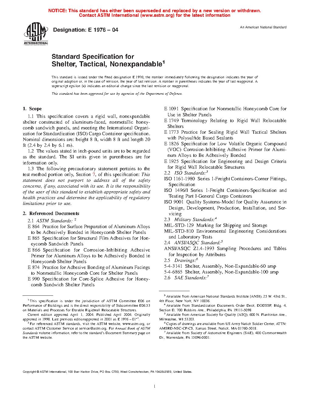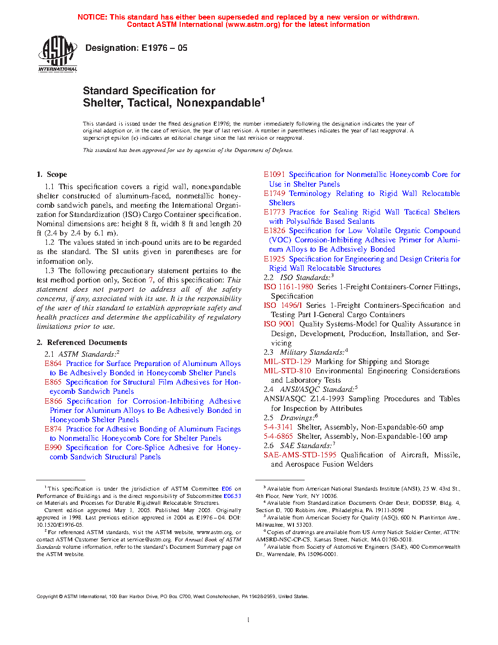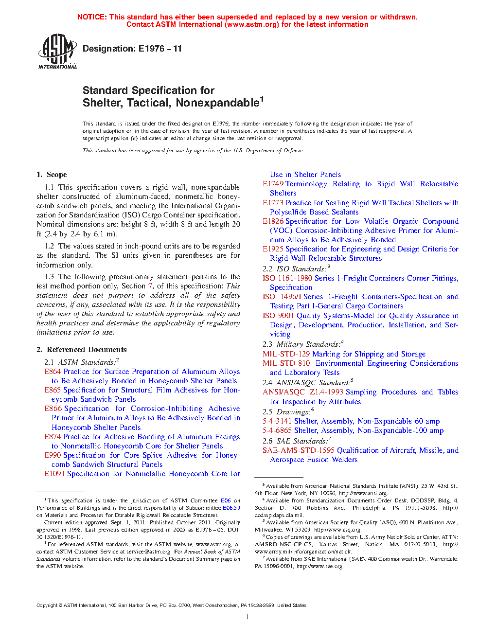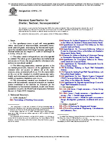 1.1 This specification covers a rigid wall, nonexpandable shelter constructed of aluminum-faced, nonmetallic honeycomb sandwich panels, and meeting the International Organization for Standardization (ISO) Cargo Container specification. Nominal dimensions are: height 8 ft, width 8 ft and length 20 ft (2.4 by 2.4 by 6.1 m).