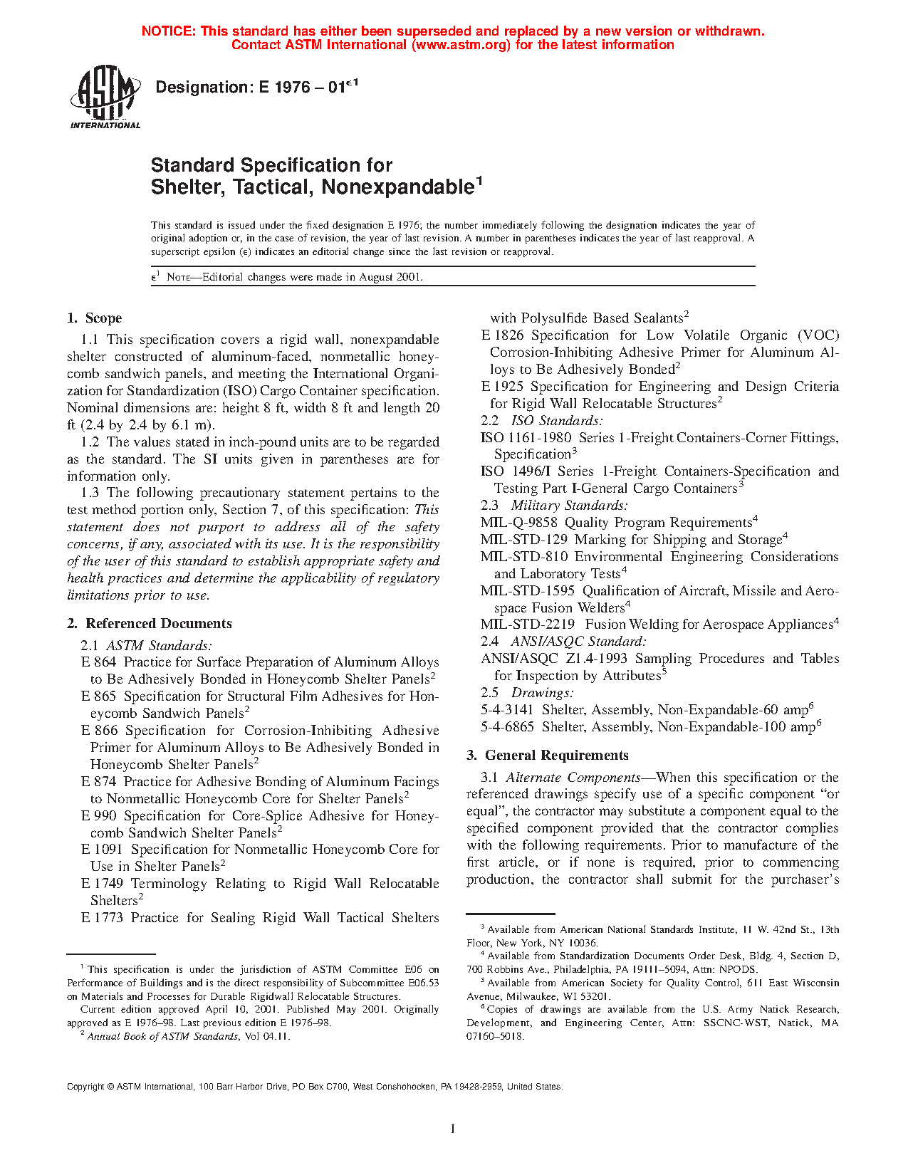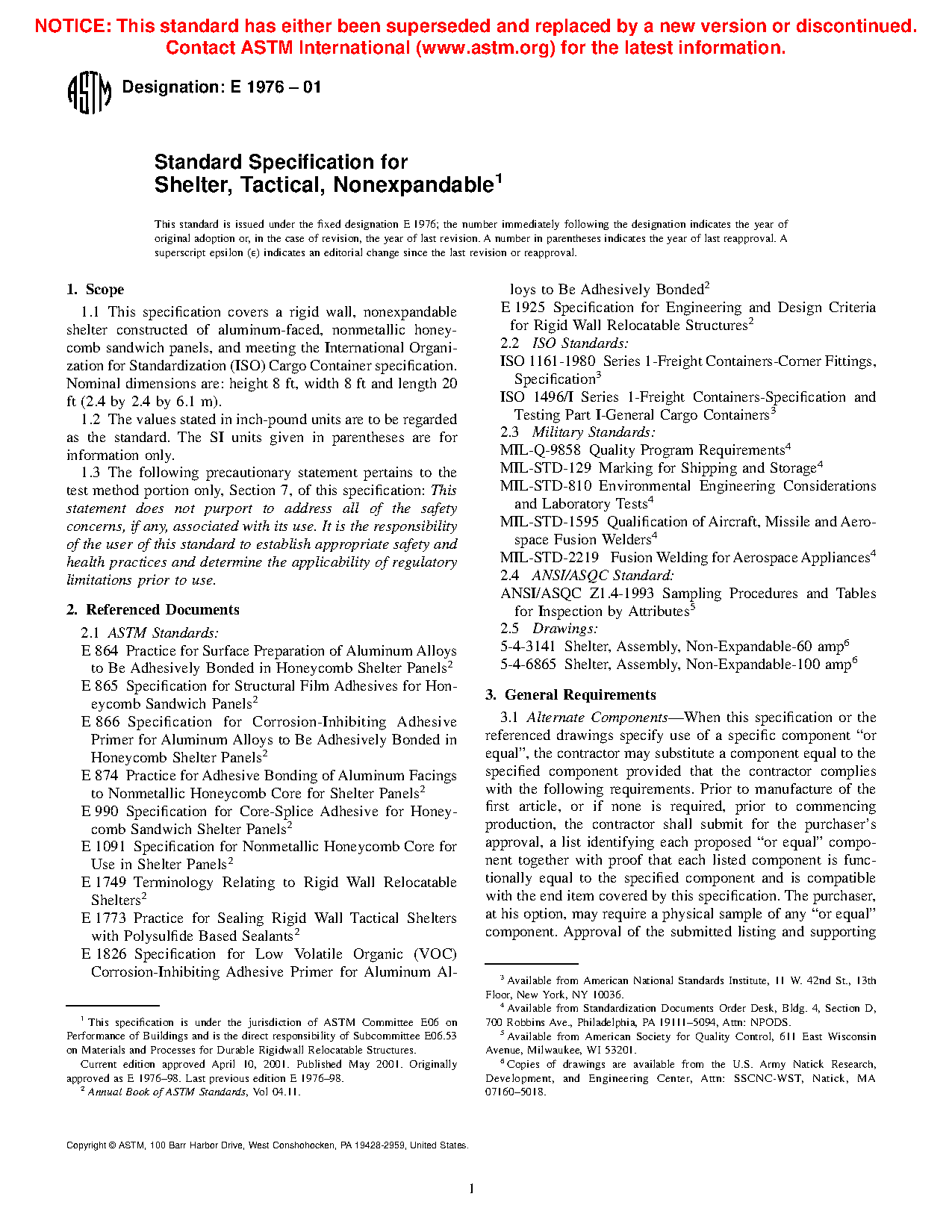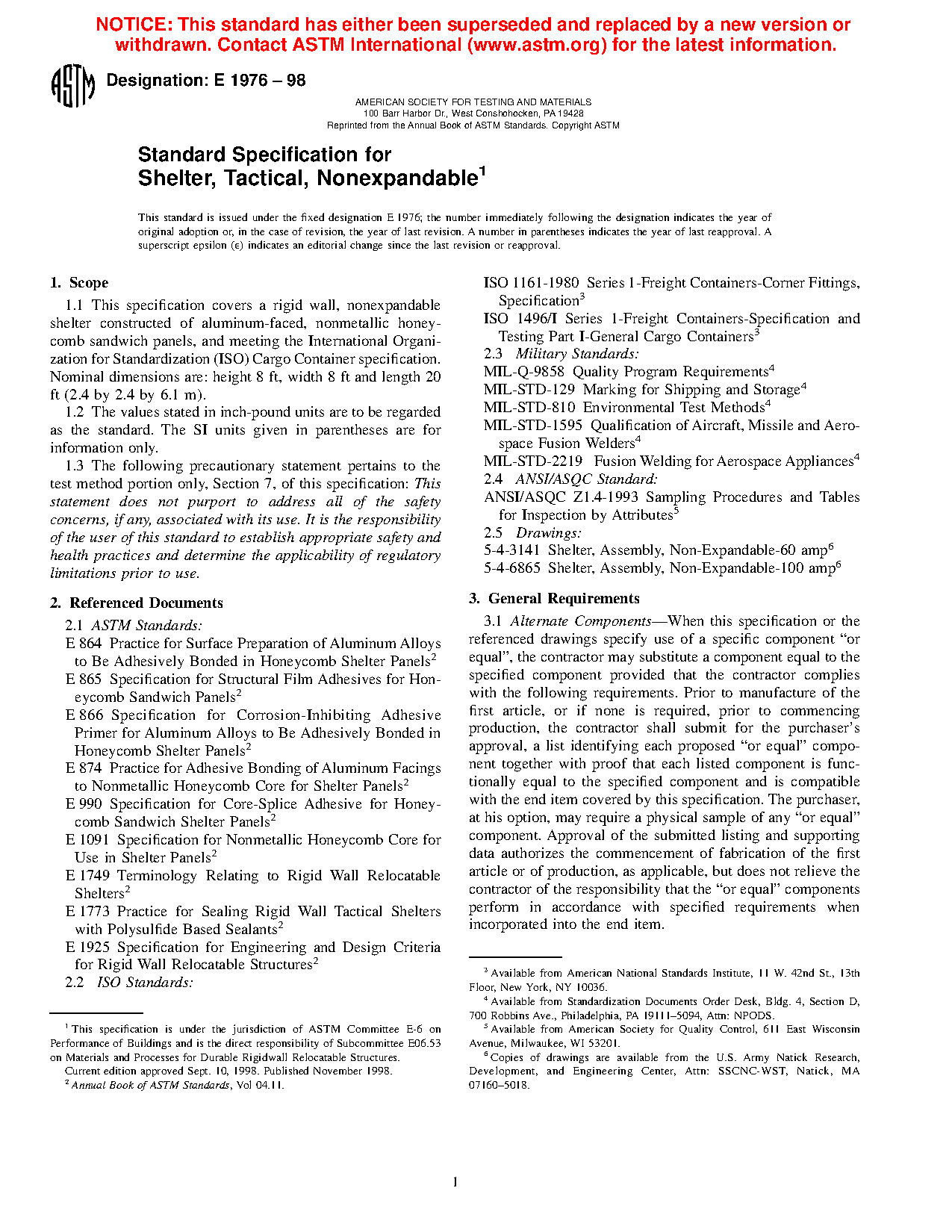 1.1 This specification covers a rigid wall, nonexpandable shelter constructed of aluminum-faced, nonmetallic honeycomb sandwich panels, and meeting the International Organization for Standardization (ISO) Cargo Container specification. Nominal dimensions are: height 8 ft, width 8 ft and length 20 ft (2.4 by 2.4 by 6.1 m).