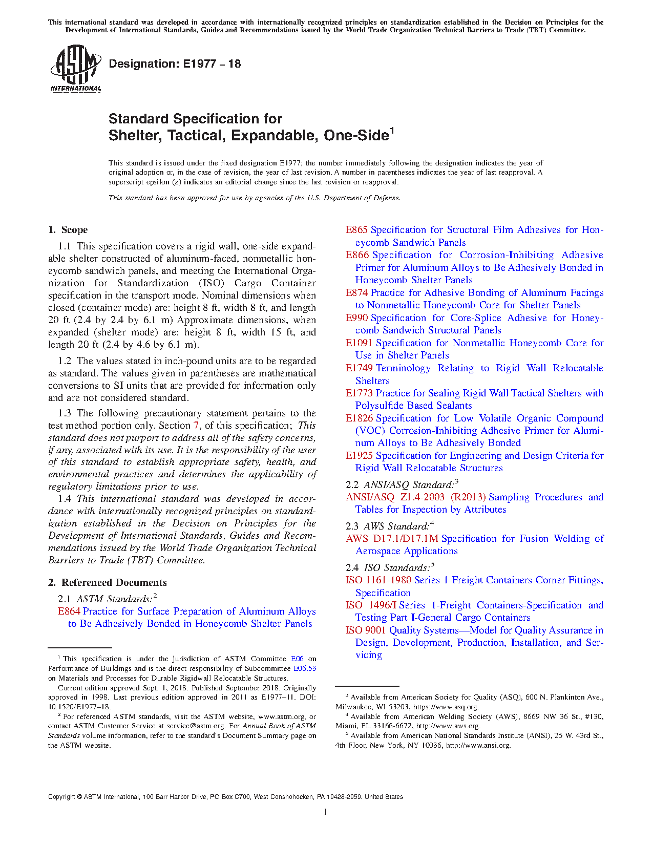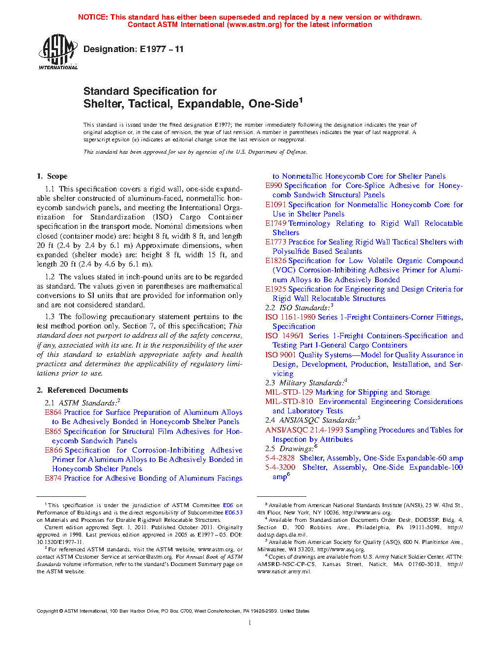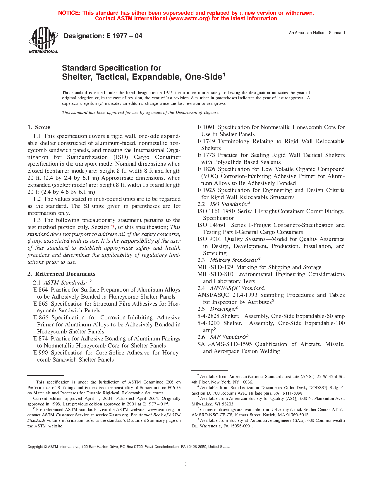 1.1 This specification covers a rigid wall, one-side expandable shelter constructed of aluminum-faced, nonmetallic honeycomb sandwich panels, and meeting the International Organization for Standardization (ISO) Cargo Container specification in the transport mode. Nominal dimensions when closed (container mode) are: height 8 ft, width 8 ft, and length 20 ft (2.4 by 2.4 by 6.1 m) Approximate dimensions, when expanded (shelter mode) are: height 8 ft, width 15 ft, and length 20 ft (2.4 by 4.6 by 6.1 m).