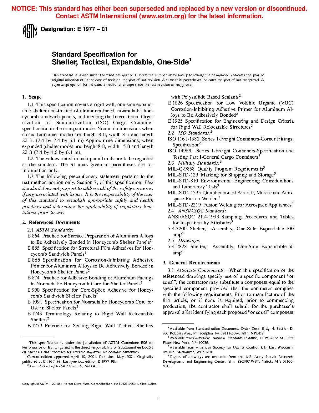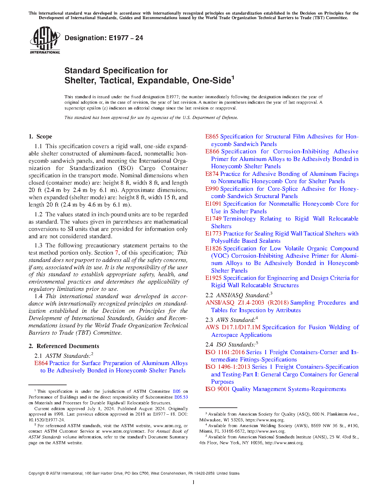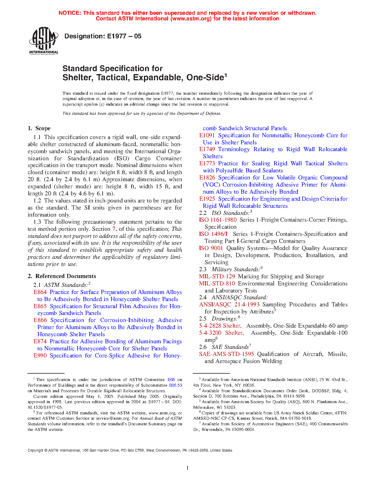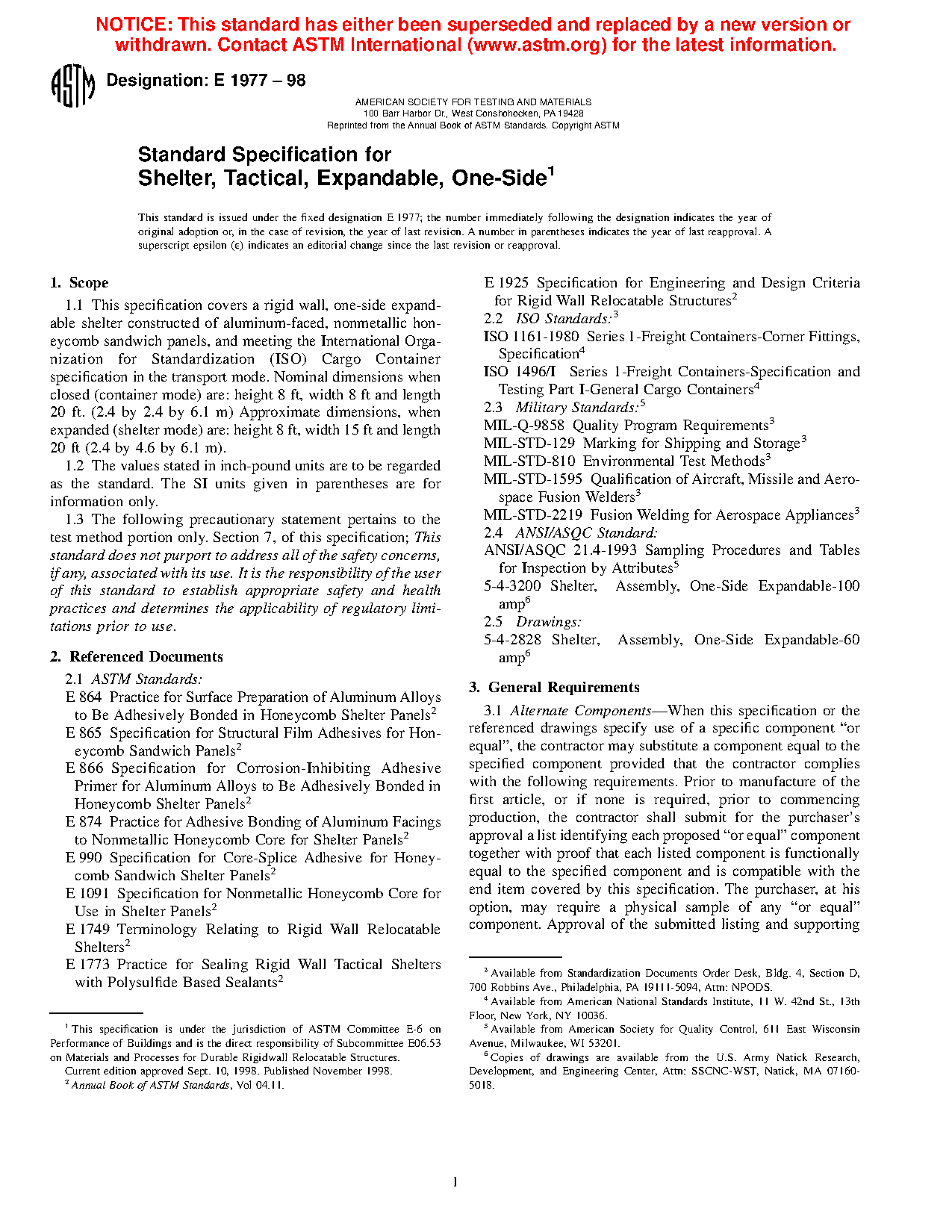 1.1 This specification covers a rigid wall, one-side expandable shelter constructed of aluminum-faced, nonmetallic honeycomb sandwich panels, and meeting the International Organization for Standardization (ISO) Cargo Container specification in the transport mode. Nominal dimensions when closed (container mode) are: height 8 ft, width 8 ft, and length 20 ft (2.4 by 2.4 by 6.1 m) Approximate dimensions, when expanded (shelter mode) are: height 8 ft, width 15 ft, and length 20 ft (2.4 by 4.6 by 6.1 m).