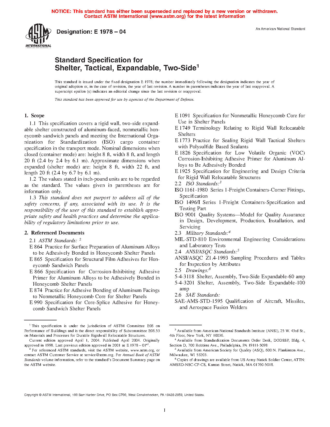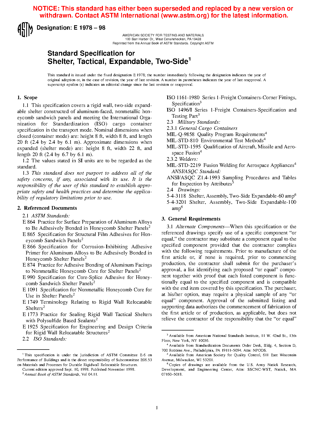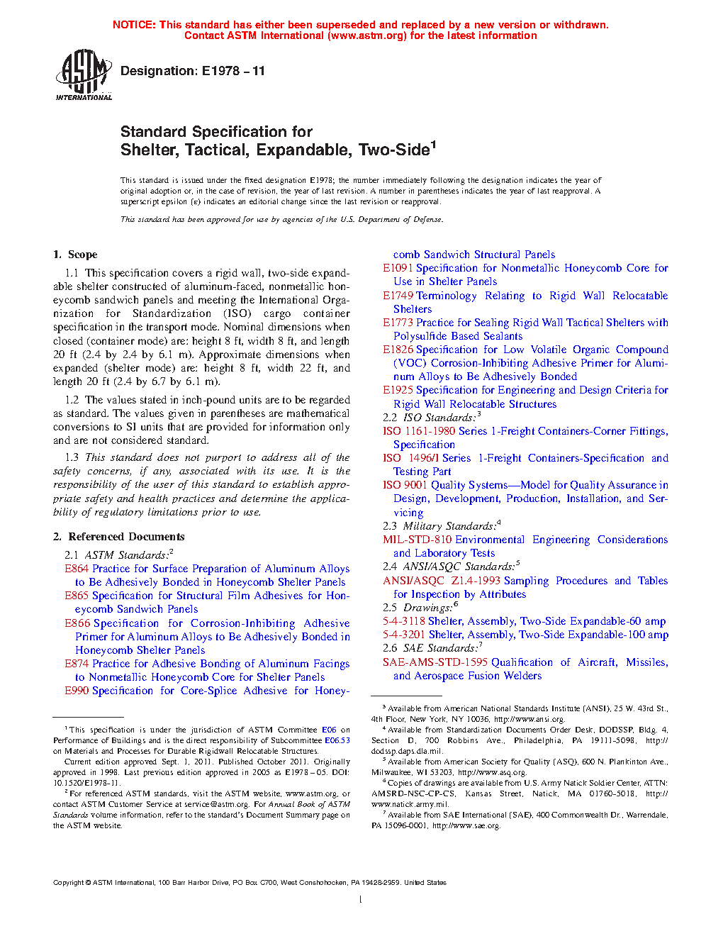 1.1 This specification covers a rigid wall, two-side expandable shelter constructed of aluminum-faced, nonmetallic honeycomb sandwich panels and meeting the International Organization for Standardization (ISO) cargo container specification in the transport mode. Nominal dimensions when closed (container mode) are: height 8 ft, width 8 ft, and length 20 ft (2.4 by 2.4 by 6.1 m). Approximate dimensions when expanded (shelter mode) are: height 8 ft, width 22 ft, and length 20 ft (2.4 by 6.7 by 6.1 m).
