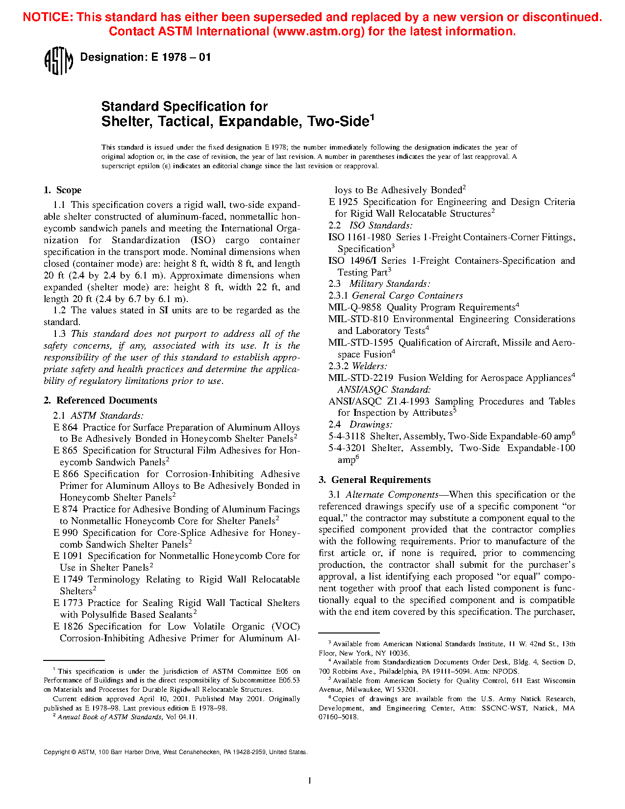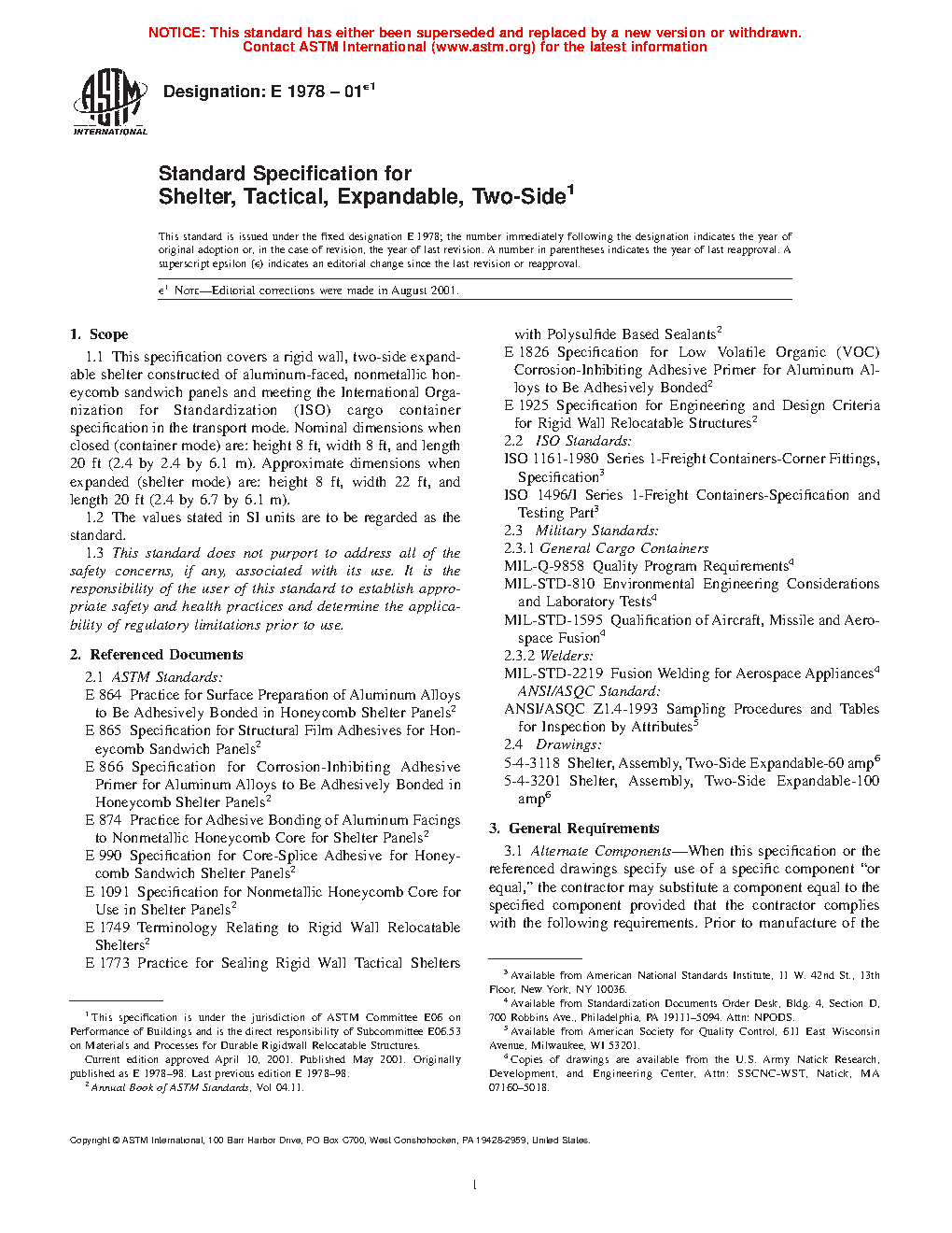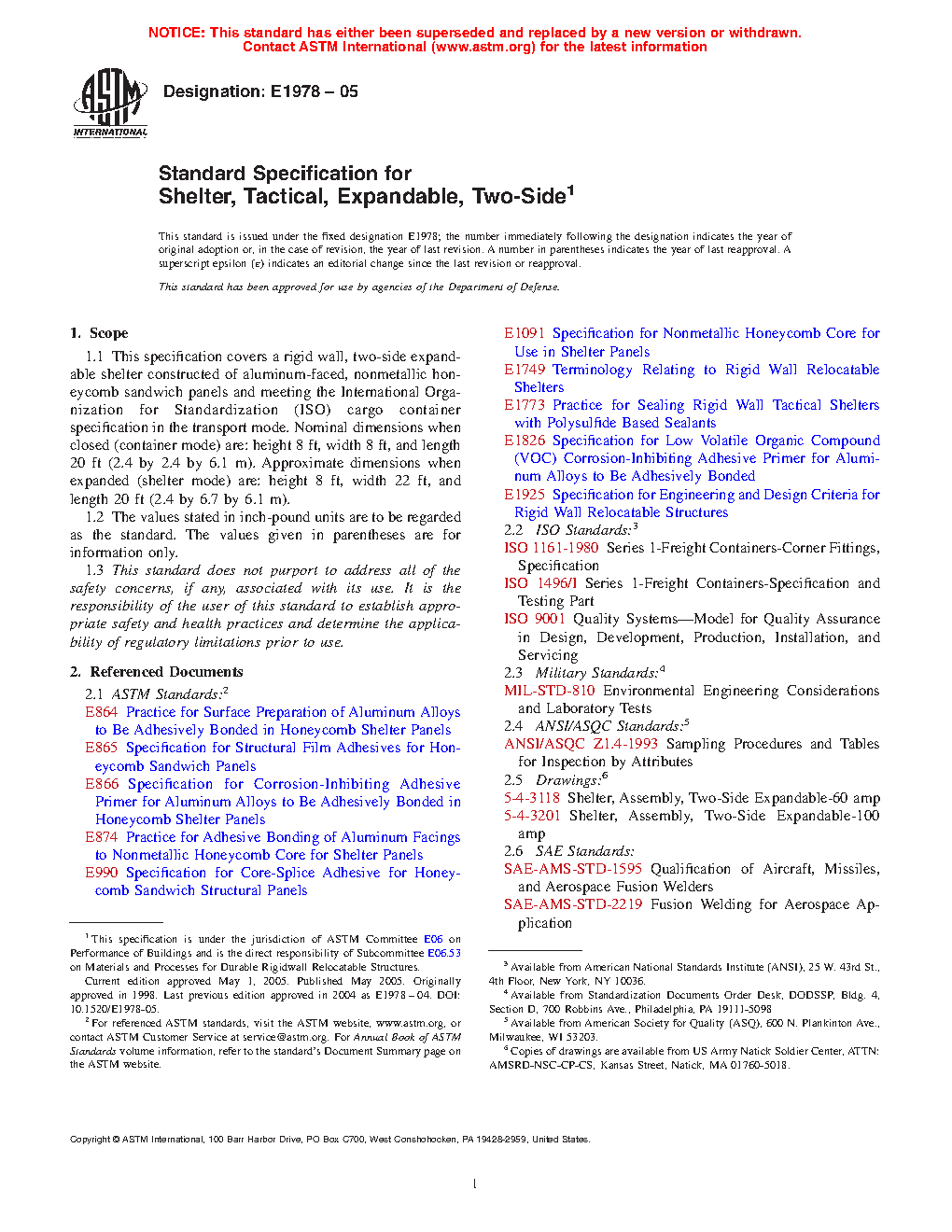 1.1 This specification covers a rigid wall, two-side expandable shelter constructed of aluminum-faced, nonmetallic honeycomb sandwich panels and meeting the International Organization for Standardization (ISO) cargo container specification in the transport mode. Nominal dimensions when closed (container mode) are: height 8 ft, width 8 ft, and length 20 ft (2.4 by 2.4 by 6.1 m). Approximate dimensions when expanded (shelter mode) are: height 8 ft, width 22 ft, and length 20 ft (2.4 by 6.7 by 6.1 m).