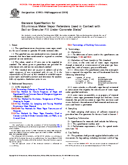 Standard Specification for Bituminous Water Vapor Retarders Used in Contact with Soil or Granular Fill Under Concrete Slabs