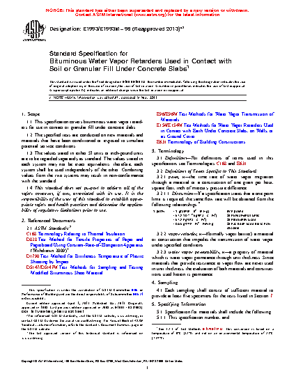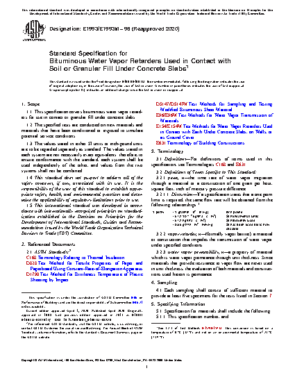 This specification covers the properties and tests for bituminous membrane water vapor retarders used in contact with soil or granular fill under concrete slabs. Tests may be conducted on both new materials and materials that have been conditioned or exposed to simulate service conditions. The water vapor retarders shall consist of asphaltic materials reinforced with multiple plies of suitable fabric, and shall meet the following property requirements when tested: water vapor permeance; tensile strength; puncture resistance; and thickness. When specifically required by the buyer for use in special conditions, the retarders shall additionally adhere to properties such as resistance to plastic flow and elevated temperatures, effect of low temperature on bending, resistance to deterioration from petroleum vehicle for soil poisons, and resistance to deterioration from exposure to ultraviolet light.