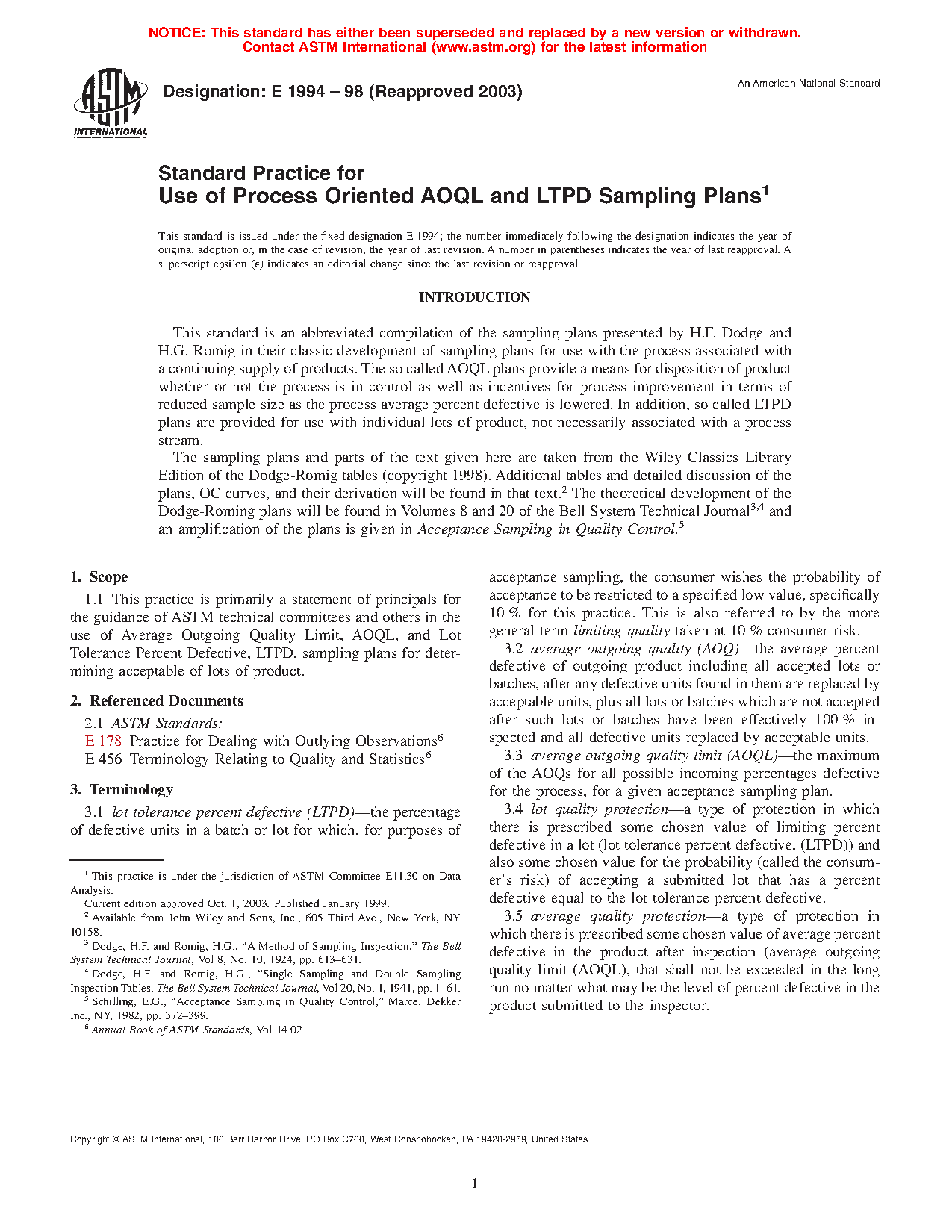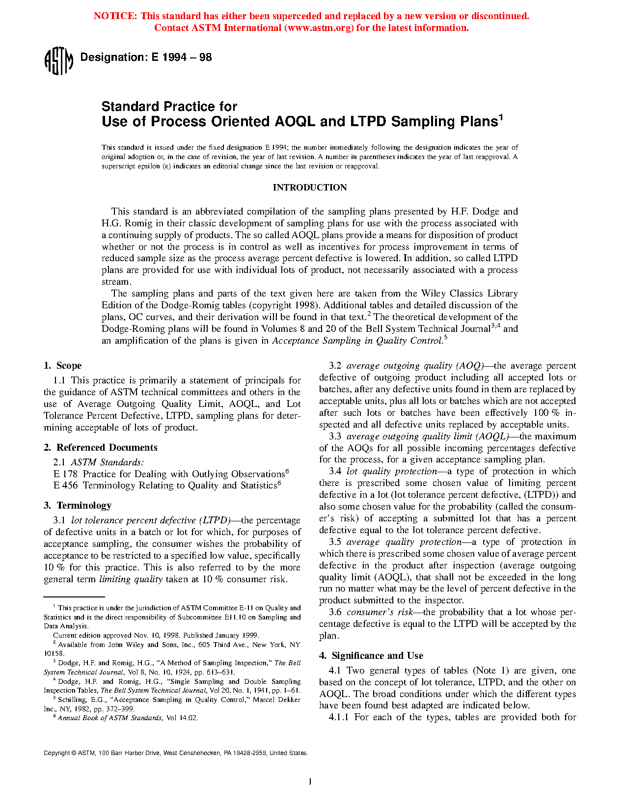 1.1 This practice is primarily a statement of principals for the guidance of ASTM technical committees and others in the use of average outgoing quality limit, AOQL, and lot tolerance percent defective, LTPD, sampling plans for determining acceptable of lots of product.