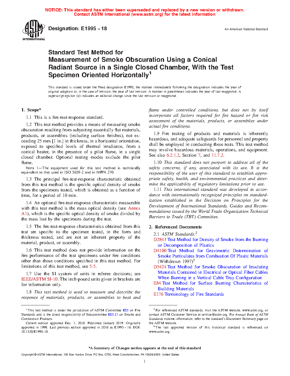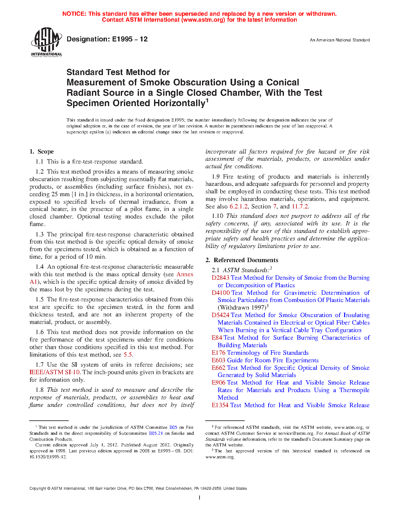 1.4 An optional fire-test-response characteristic measurable with this test method is the mass optical density (see Annex A1), which is the specific optical density of smoke divided by the mass lost by the specimens during the test.