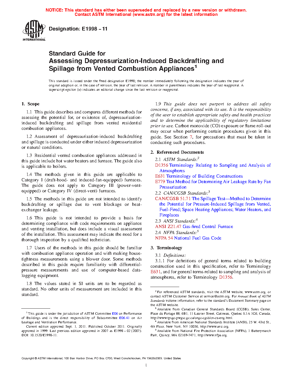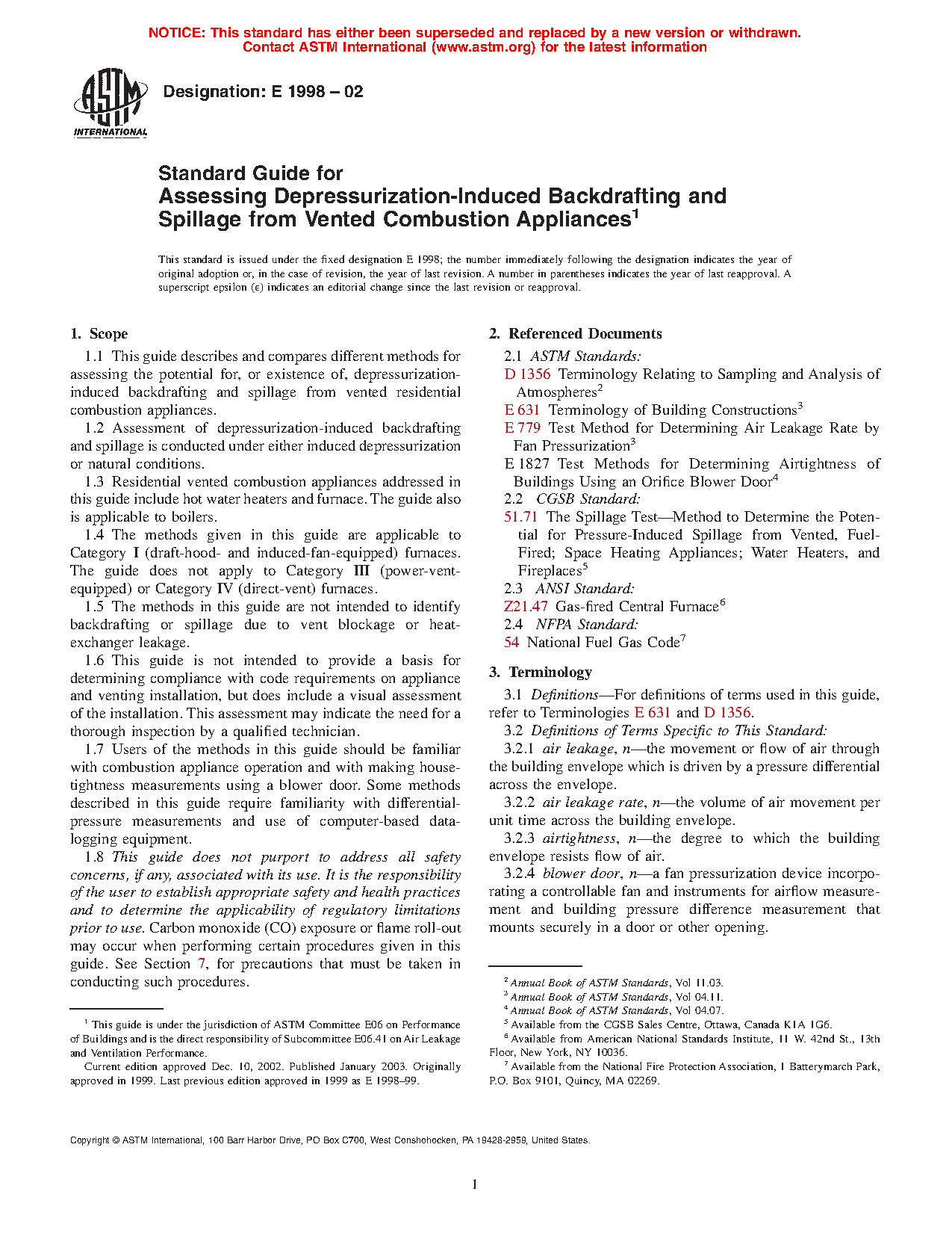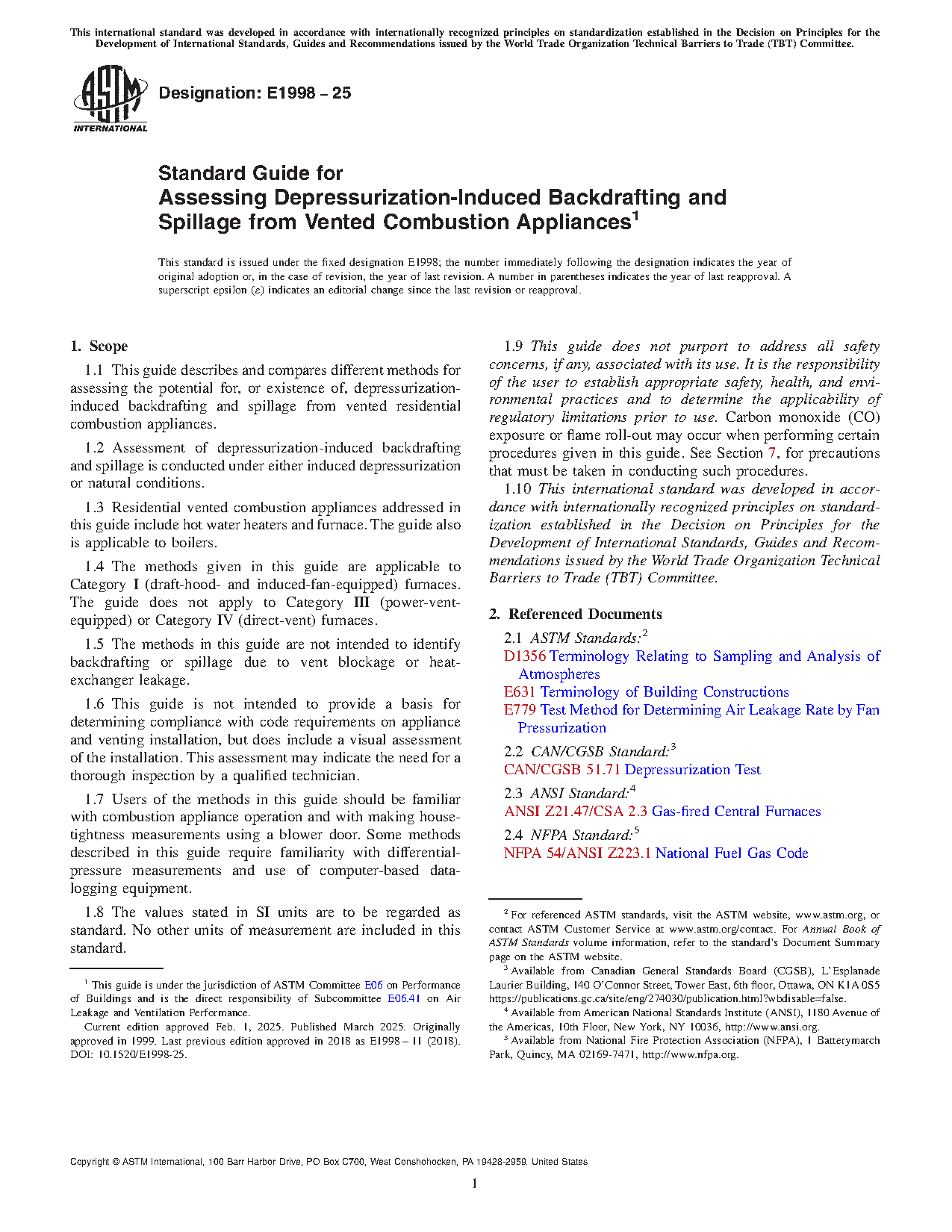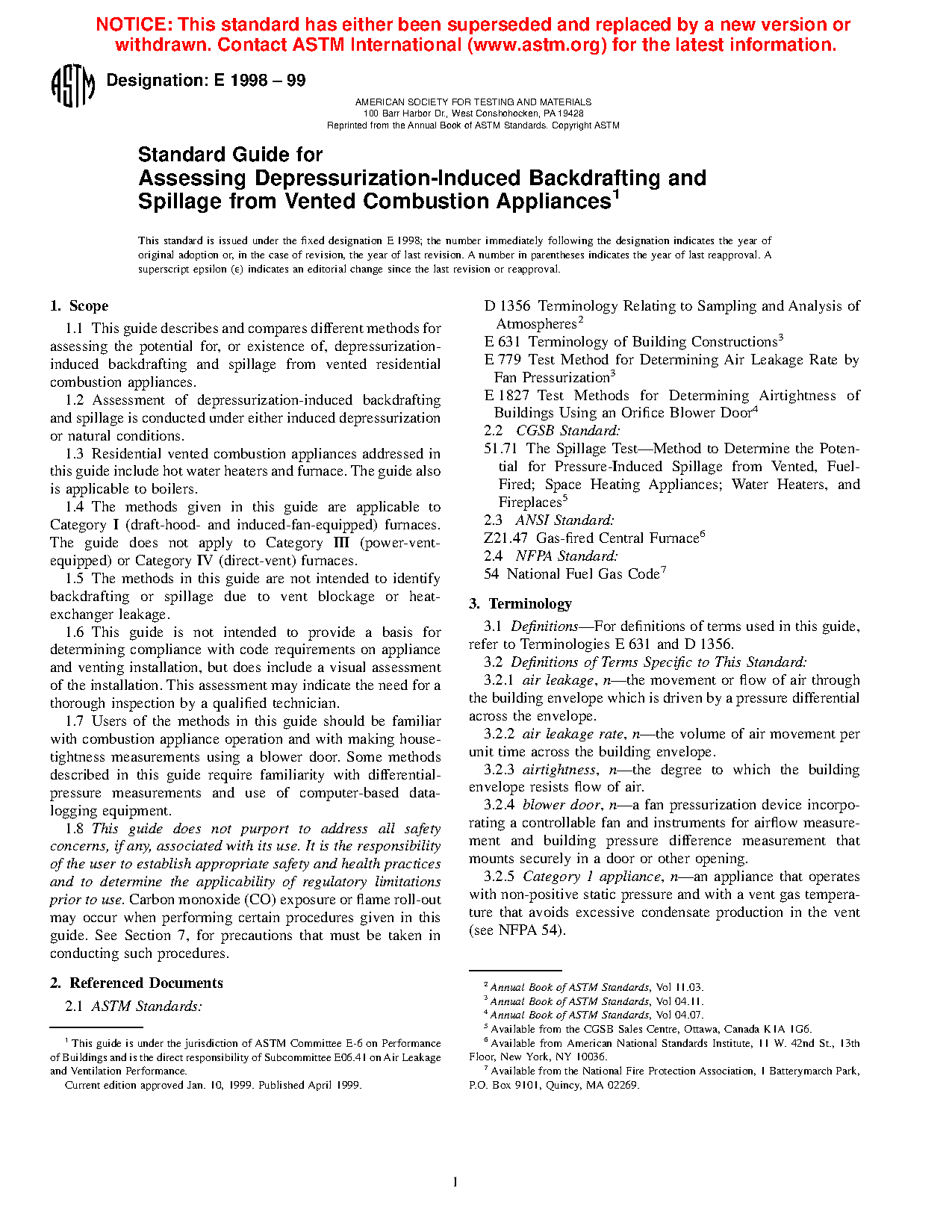 1.1 This guide describes and compares different methods for assessing the potential for, or existence of, depressurization-induced backdrafting and spillage from vented residential combustion appliances.