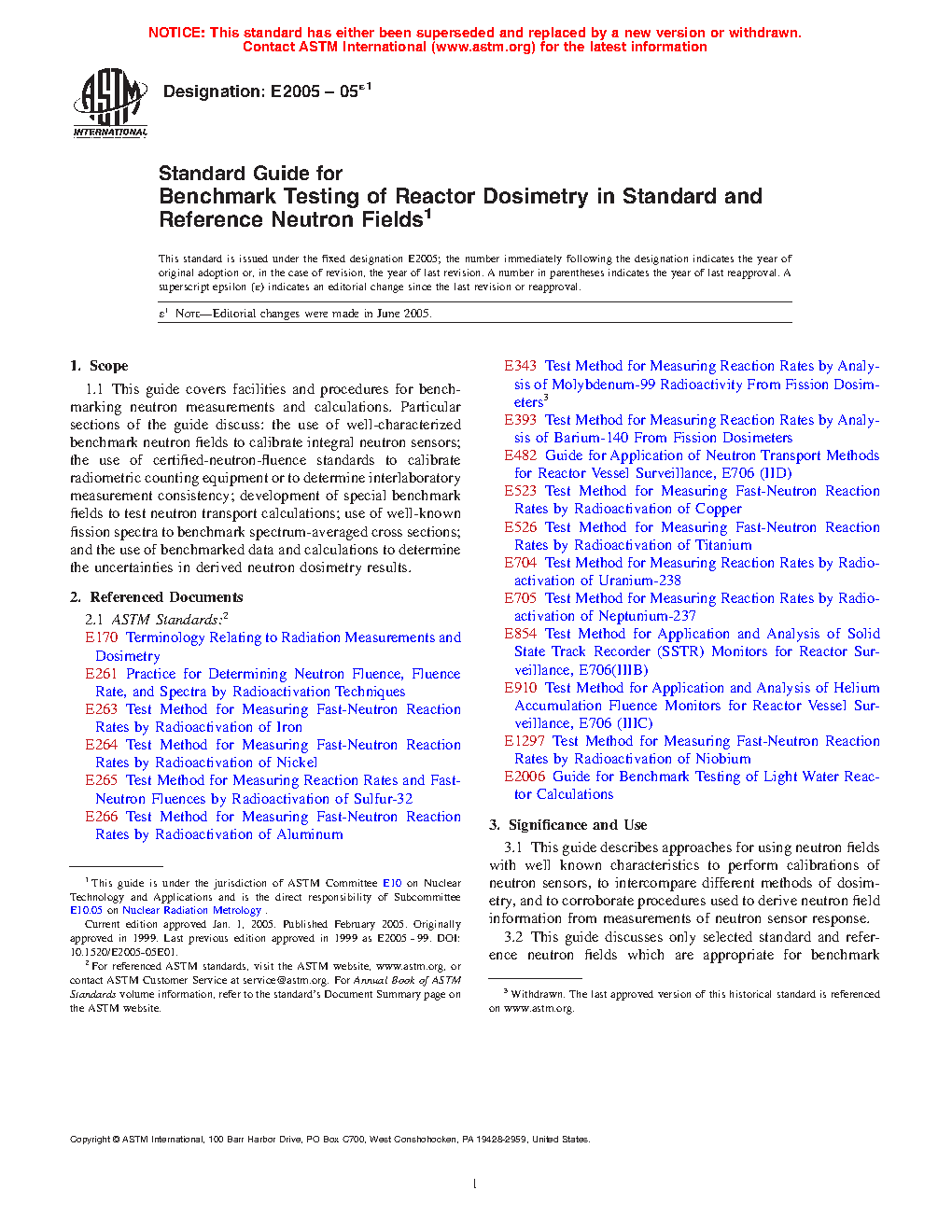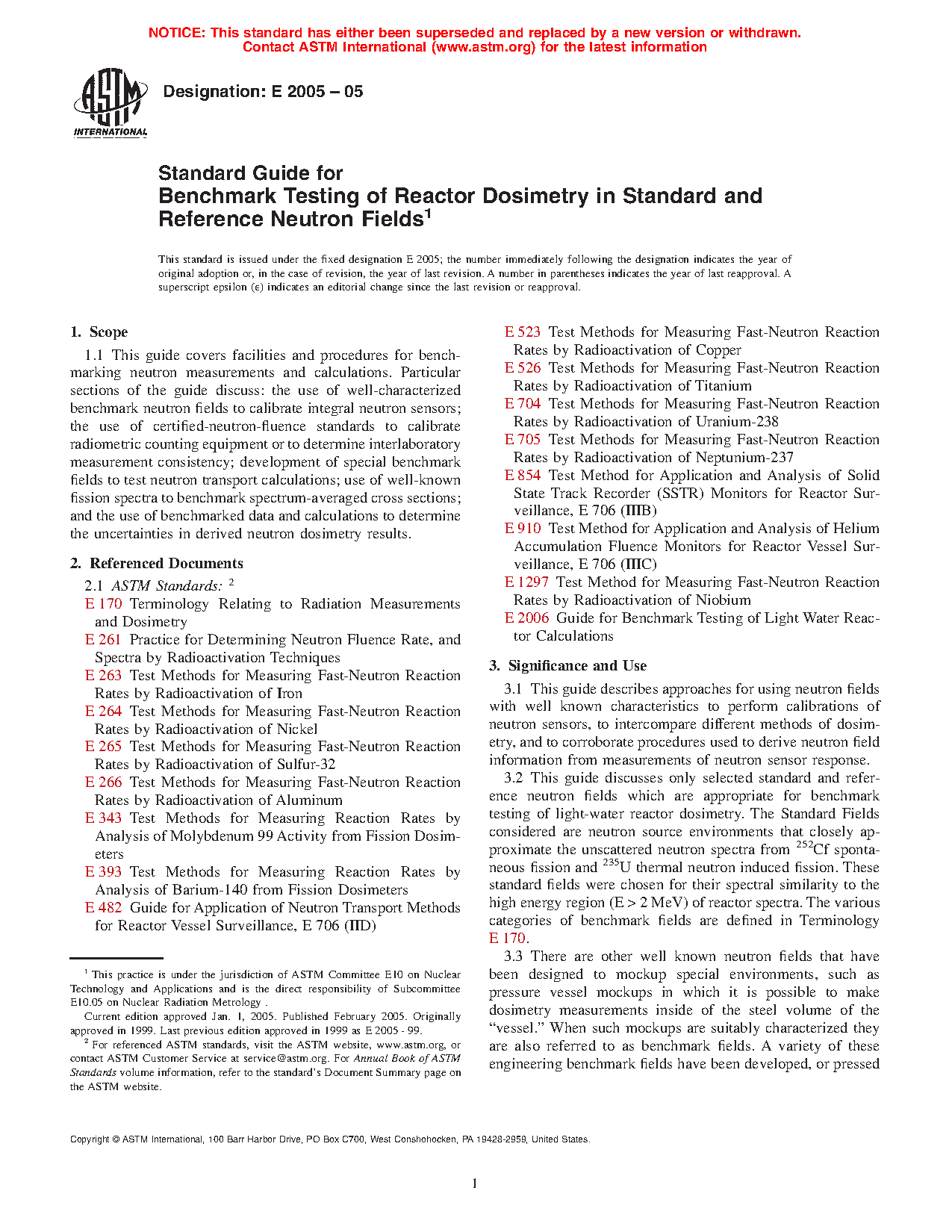 3.2 This guide discusses only selected standard and reference neutron fields which are appropriate for benchmark testing of light-water reactor dosimetry. The Standard Fields considered here include neutron source environments that closely approximate: a) the unscattered neutron spectra from 252Cf spontaneous fission; and b) the 235U thermal neutron induced fission. These standard fields were chosen for their spectral similarity to the high energy region (E > 2 MeV) of reactor spectra. The various categories of benchmark fields are defined in Terminology E170.