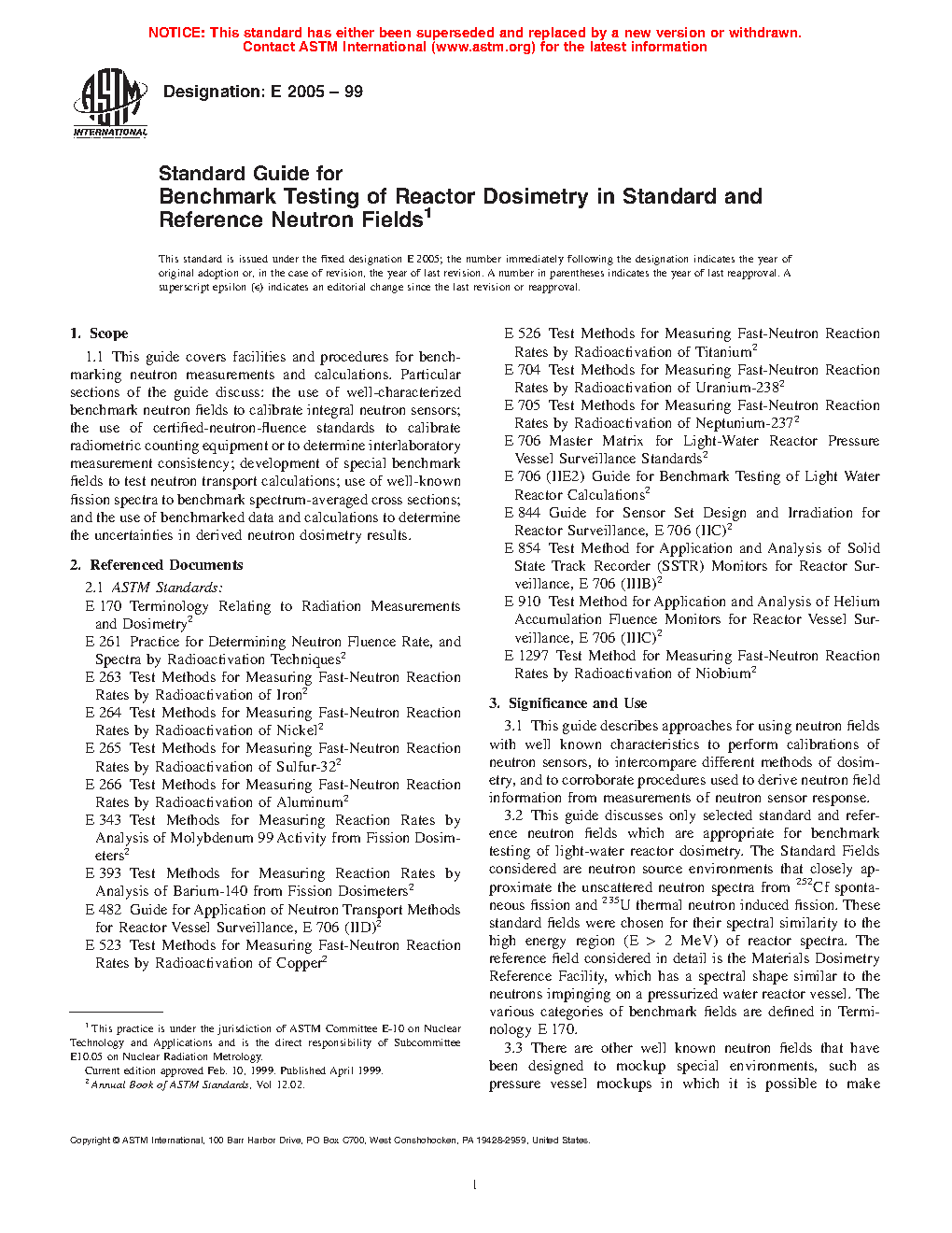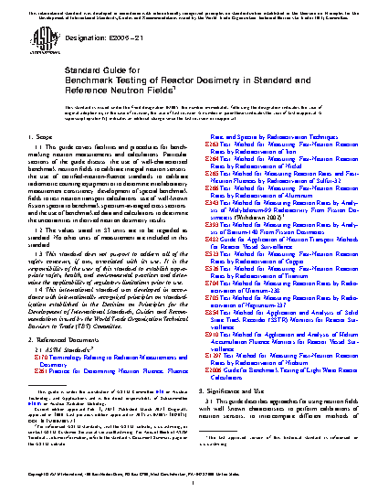 3.3 There are other well known neutron fields that have been designed to mockup special environments, such as pressure vessel mockups in which it is possible to make dosimetry measurements inside of the steel volume of the “vessel.” When such mockups are suitably characterized, they are also referred to as benchmark fields. A variety of these engineering benchmark fields have been developed, or pressed into service, to improve the accuracy of neutron dosimetry measurement techniques. These special benchmark experiments are discussed in Guide E2006, and in Refs (1)4 and (2).