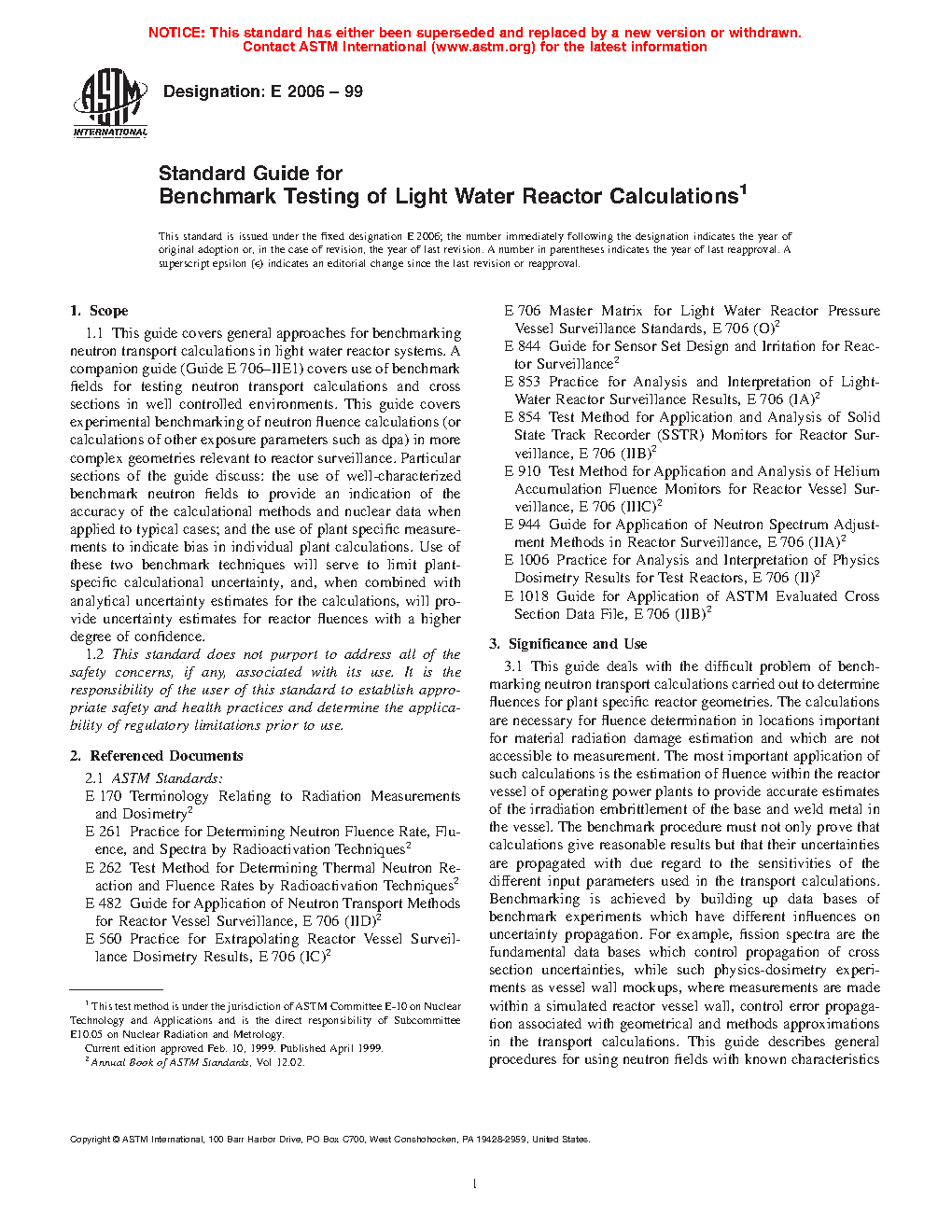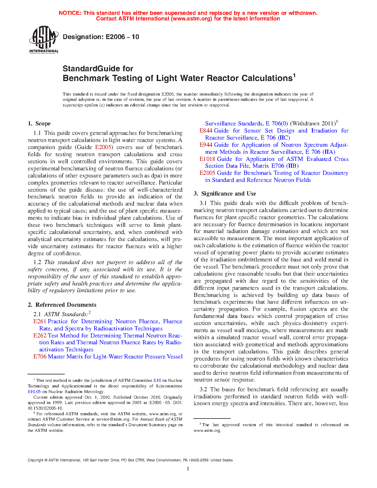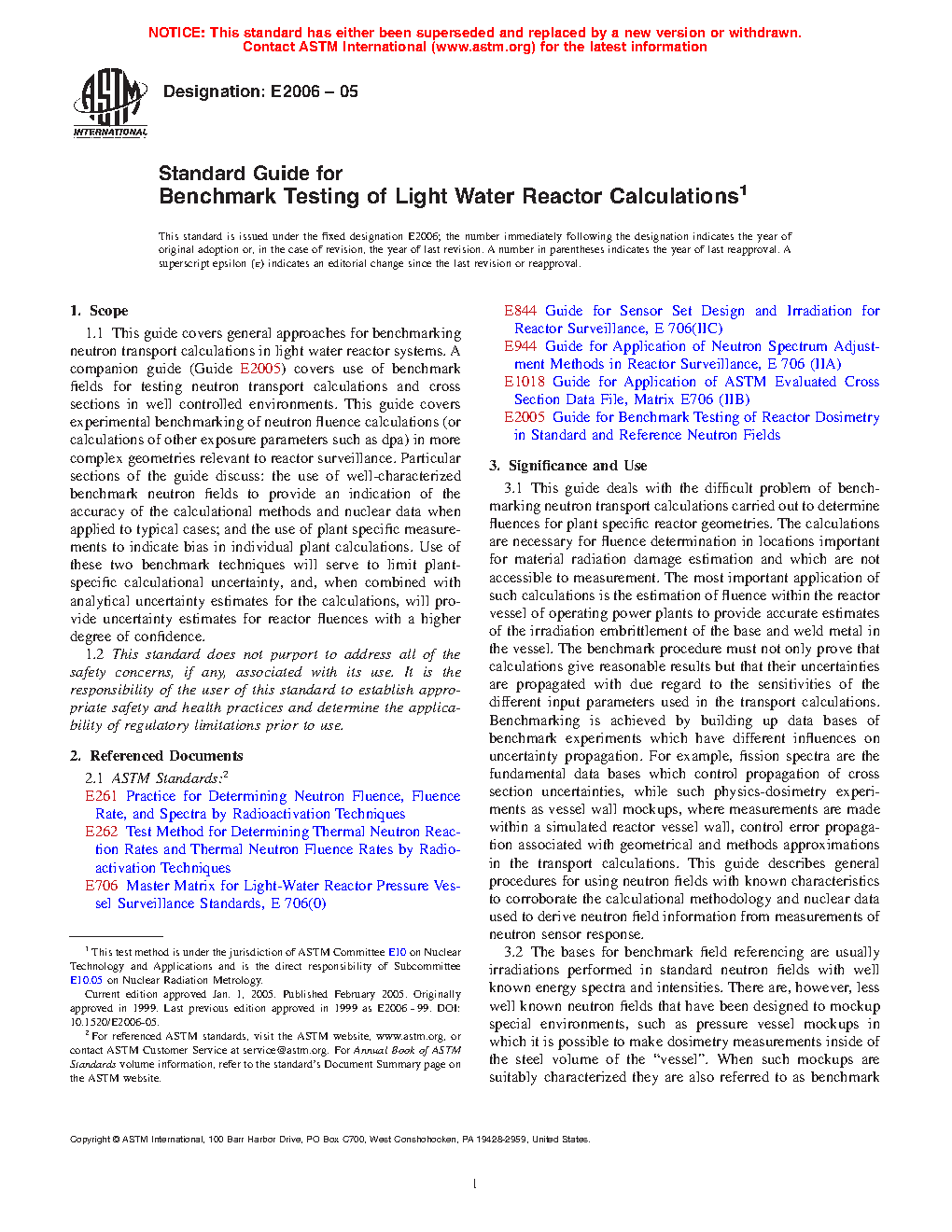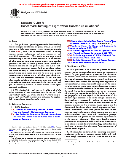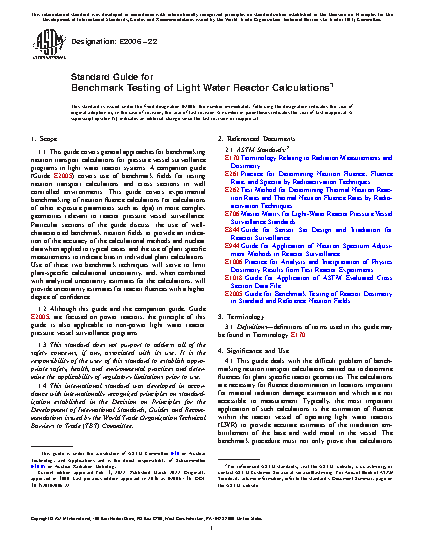 1.1 This guide covers general approaches for benchmarking neutron transport calculations in light water reactor systems. A companion guide (Guide E 706-IIE1) covers use of benchmark fields for testing neutron transport calculations and cross sections in well controlled environments. This guide covers experimental benchmarking of neutron fluence calculations (or calculations of other exposure parameters such as dpa) in more complex geometries relevant to reactor surveillance. Particular sections of the guide discuss: the use of well-characterized benchmark neutron fields to provide an indication of the accuracy of the calculational methods and nuclear data when applied to typical cases; and the use of plant specific measurements to indicate bias in individual plant calculations. Use of these two benchmark techniques will serve to limit plant-specific calculational uncertainty, and, when combined with analytical uncertainty estimates for the calculations, will provide uncertainty estimates for reactory fluences with a higher degree of confidence.