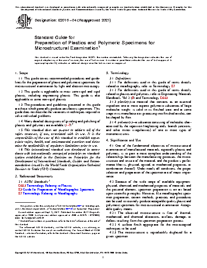 1.1 This guide covers recommended procedures and guidelines for the preparation of plastic and polymeric specimens for microstructural examination by light and electron microscopy.