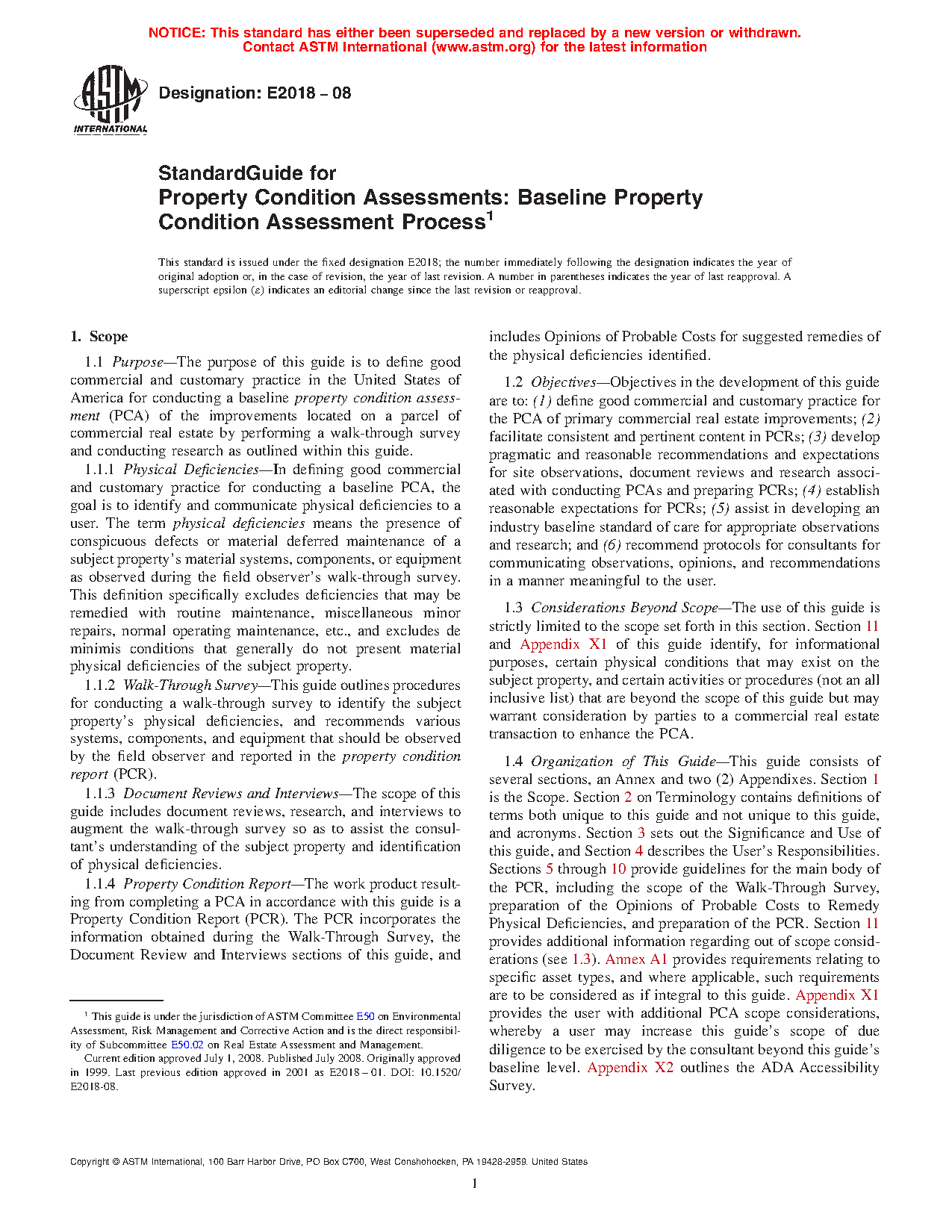 1.4 Organization of This Guide—This guide consists of several sections, an Annex and two Appendixes. Section 1 is the Scope. Section 2 on Terminology contains definitions of terms both unique to this guide and not unique to this guide, and acronyms. Section 3 sets out the Significance and Use of this guide, and Section 4 describes the User's Responsibilities. Sections 5 through 10 provide guidelines for the main body of the PCA, including the scope of the Walk-Through Survey, preparation of the Opinions of Probable Costs to Remedy Physical Deficiencies, and preparation of the PCR. Section 11 provides additional information regarding out of scope considerations (see 1.3). Annex A1 provides requirements relating to specific asset types, and where applicable, such requirements are to be considered as if integral to this guide. Appendix X1 provides the user with additional PCA scope considerations, whereby a user may increase this guide's baseline scope of due diligence to be exercised by the consultant. Appendix X2 outlines the ADA Accessibility Survey.