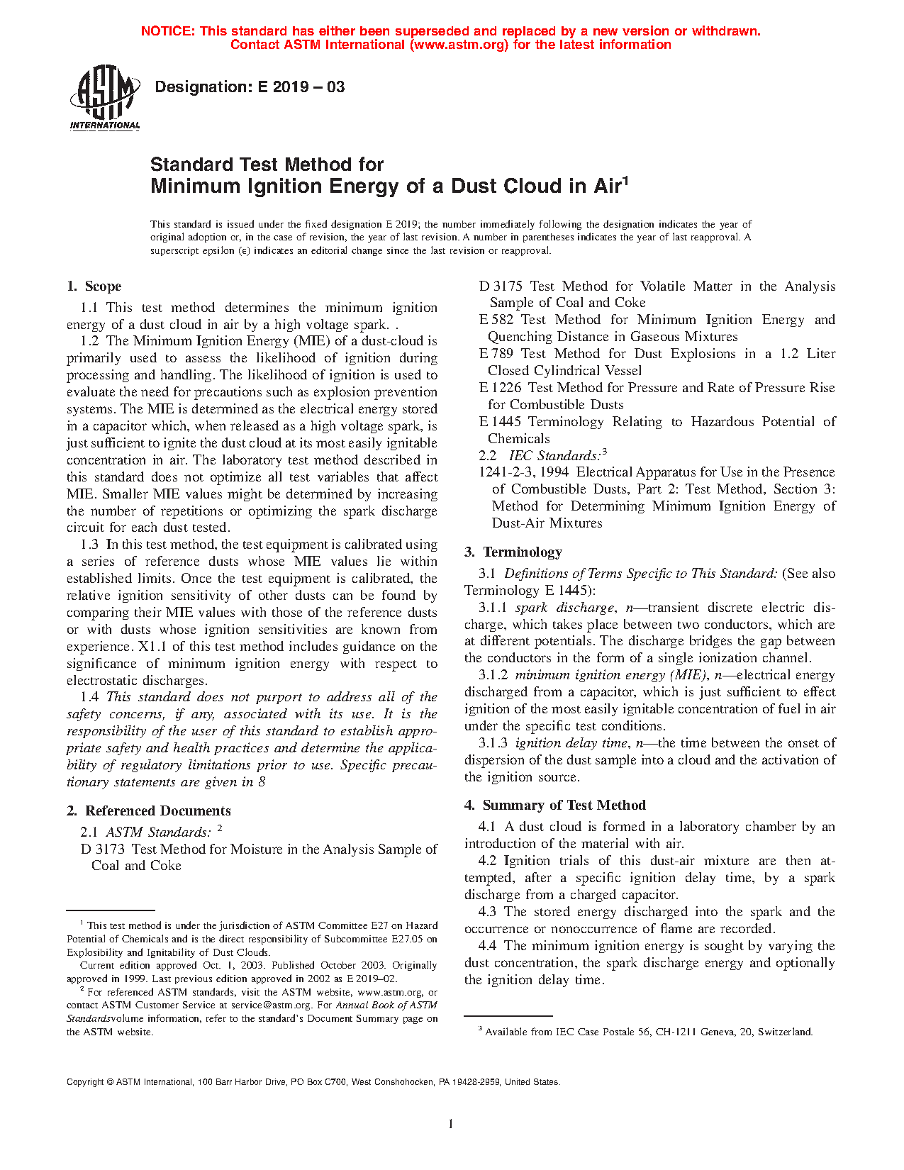 1.1 This test method determines the minimum ignition energy of a dust cloud in air by a high voltage spark.