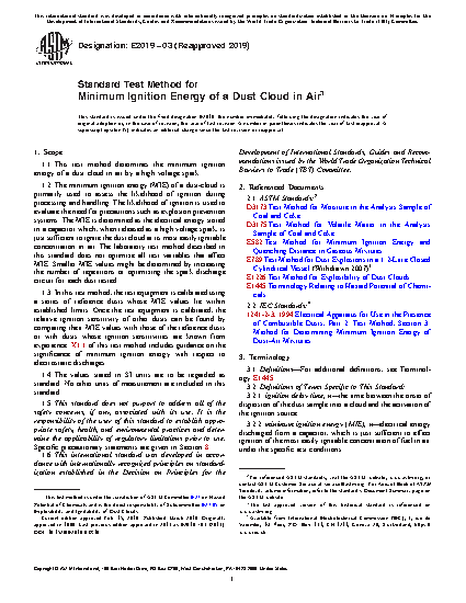 1.2 The minimum ignition energy (MIE) of a dust-cloud is primarily used to assess the likelihood of ignition during processing and handling. The likelihood of ignition is used to evaluate the need for precautions such as explosion prevention systems. The MIE is determined as the electrical energy stored in a capacitor which, when released as a high voltage spark, is just sufficient to ignite the dust cloud at its most easily ignitable concentration in air. The laboratory test method described in this standard does not optimize all test variables that affect MIE. Smaller MIE values might be determined by increasing the number of repetitions or optimizing the spark discharge circuit for each dust tested.